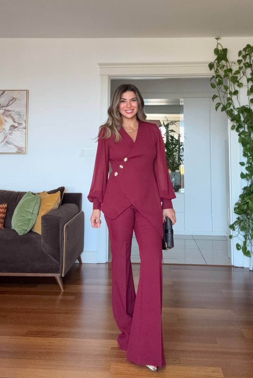 A burgundy blazer top and matching pants set that combines elegance and modernity.