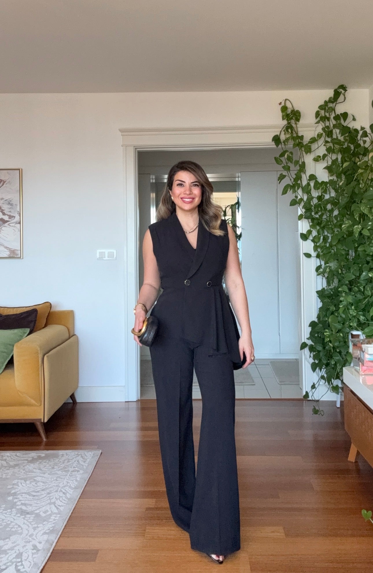• Bottom: High-waisted, wide-leg (Palazzo) trousers that gracefully follow the body contours. Designed with pressed crease details to make the legs appear longer.