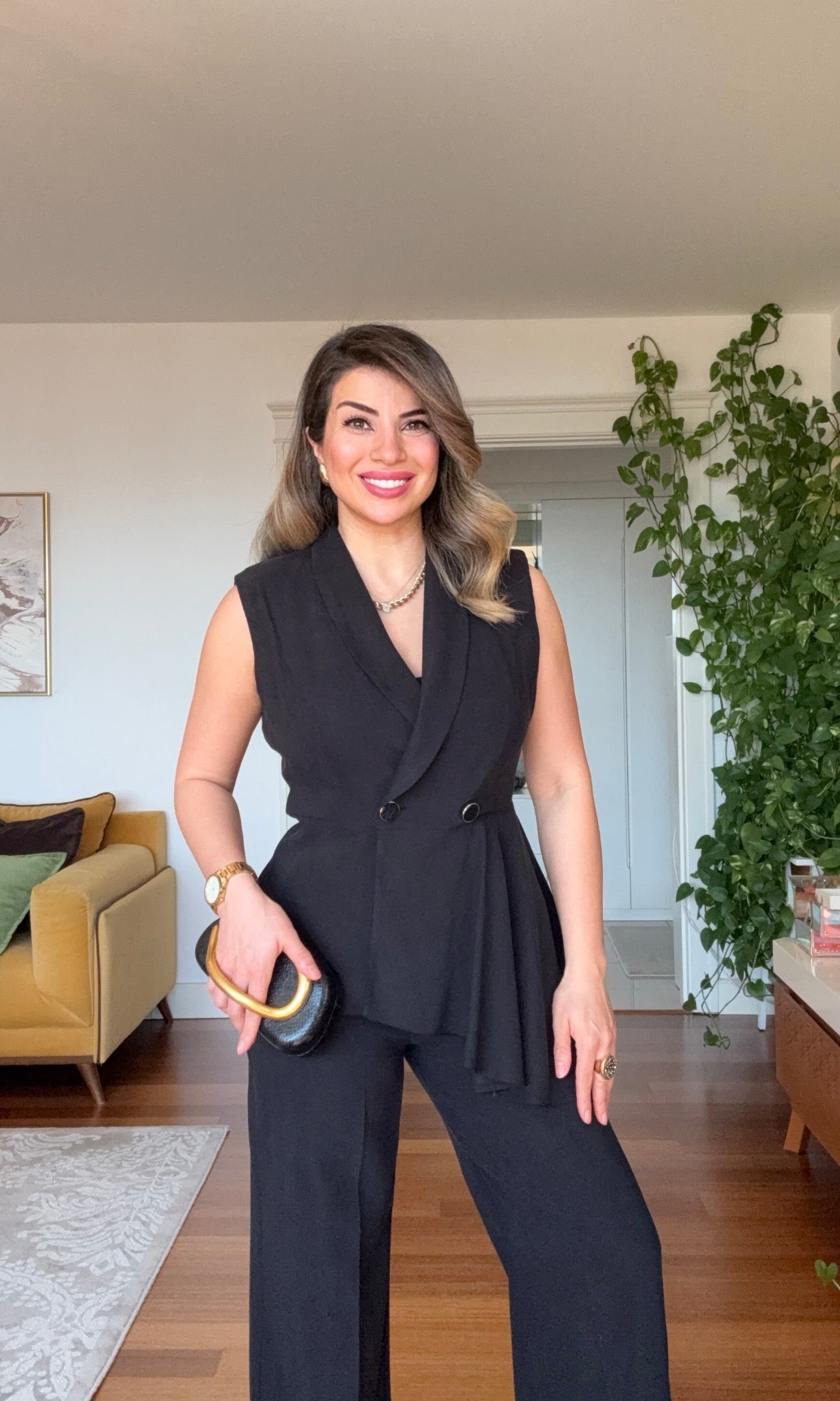 • Top: Features a double-breasted collar design, an asymmetric shawl detail that accentuates the waist, and stylish metal button accents for a modern silhouette. Its sleeveless design allows it to be worn alone or layered under a jacket.