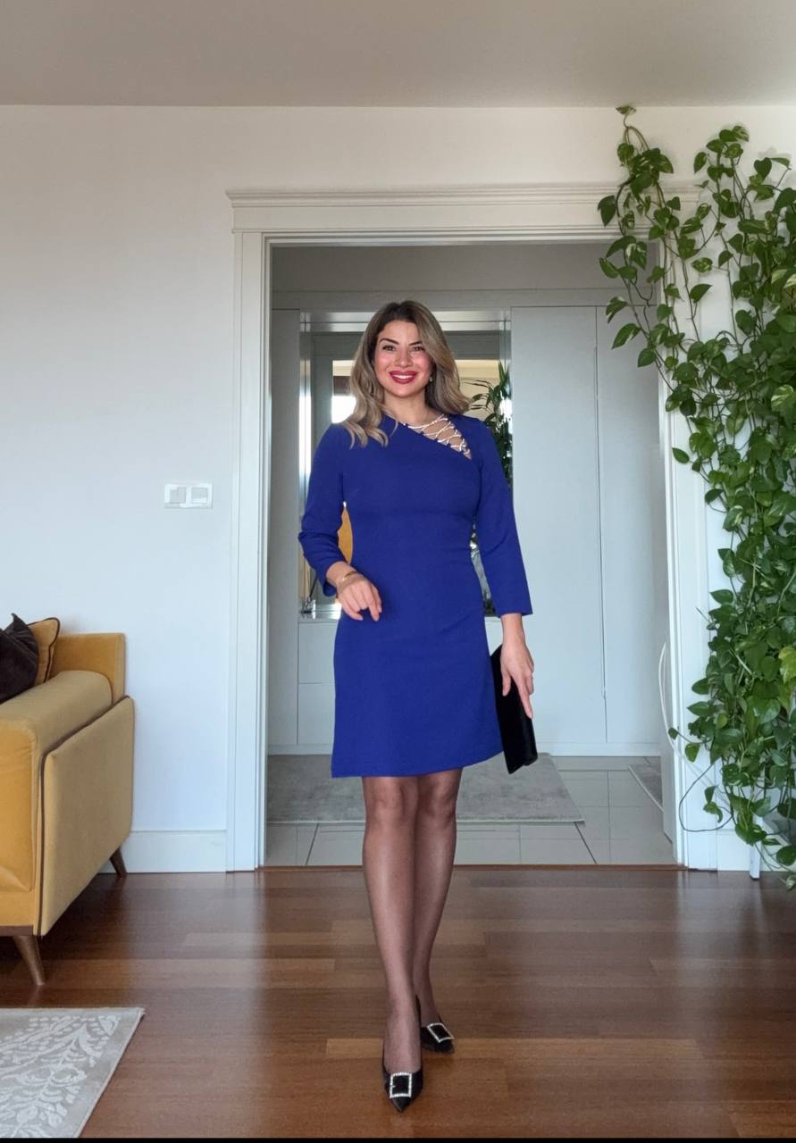 ASYMMETRIC NECKLINE CRYSTAL DETAILED DRESS - BLUE