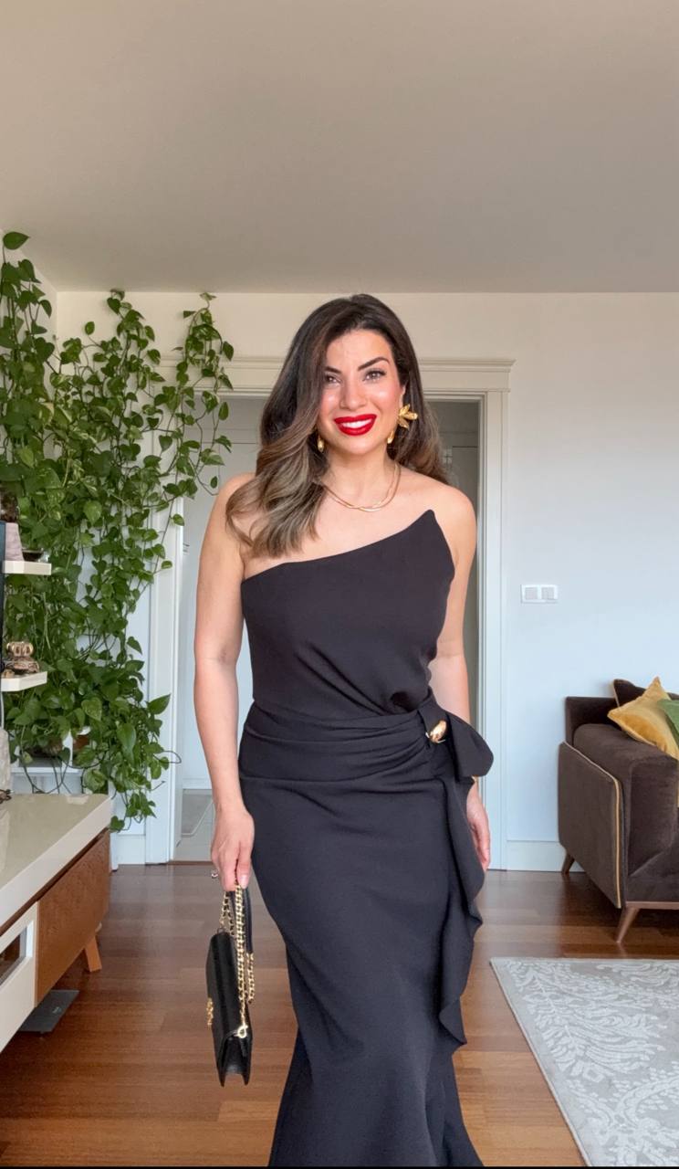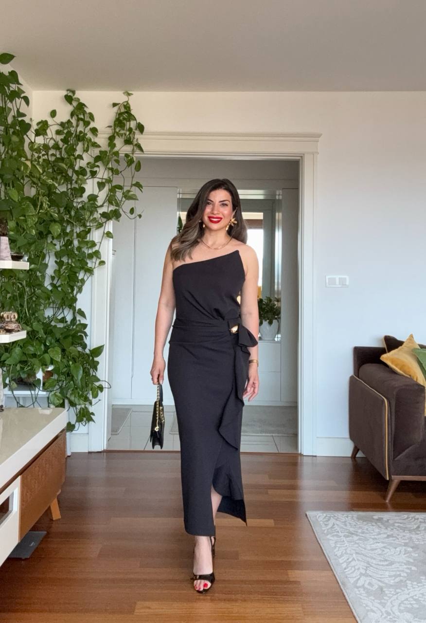 A timeless symbol of elegance, this black dress combines grace and bold sophistication. Featuring a one-shoulder asymmetric design, it offers a modern silhouette, while the large bow detail at the waist with a gold buckle adds a refined touch. The figure-hugging fit flatters your shape, and the ruffled slit skirt adds graceful movement with every step.