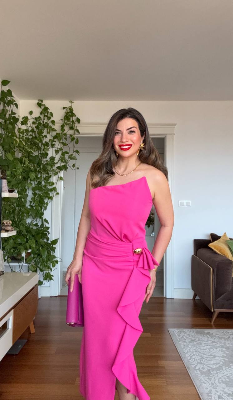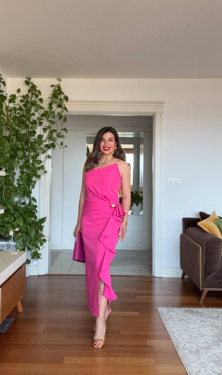 Elegance and modern sophistication meet in this fuchsia dress, designed to make you stand out at special events. With its one-shoulder cut, it creates a feminine silhouette, while the oversized bow detail at the waist, finished with a gold-tone buckle, adds a refined touch. The body-hugging fit highlights your figure gracefully, and the ruffled skirt detail brings fluid movement to every step.