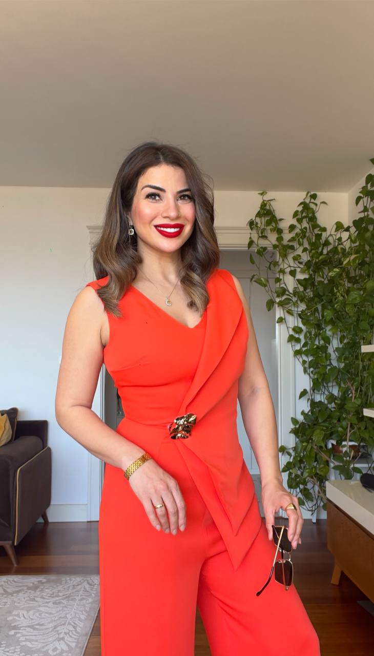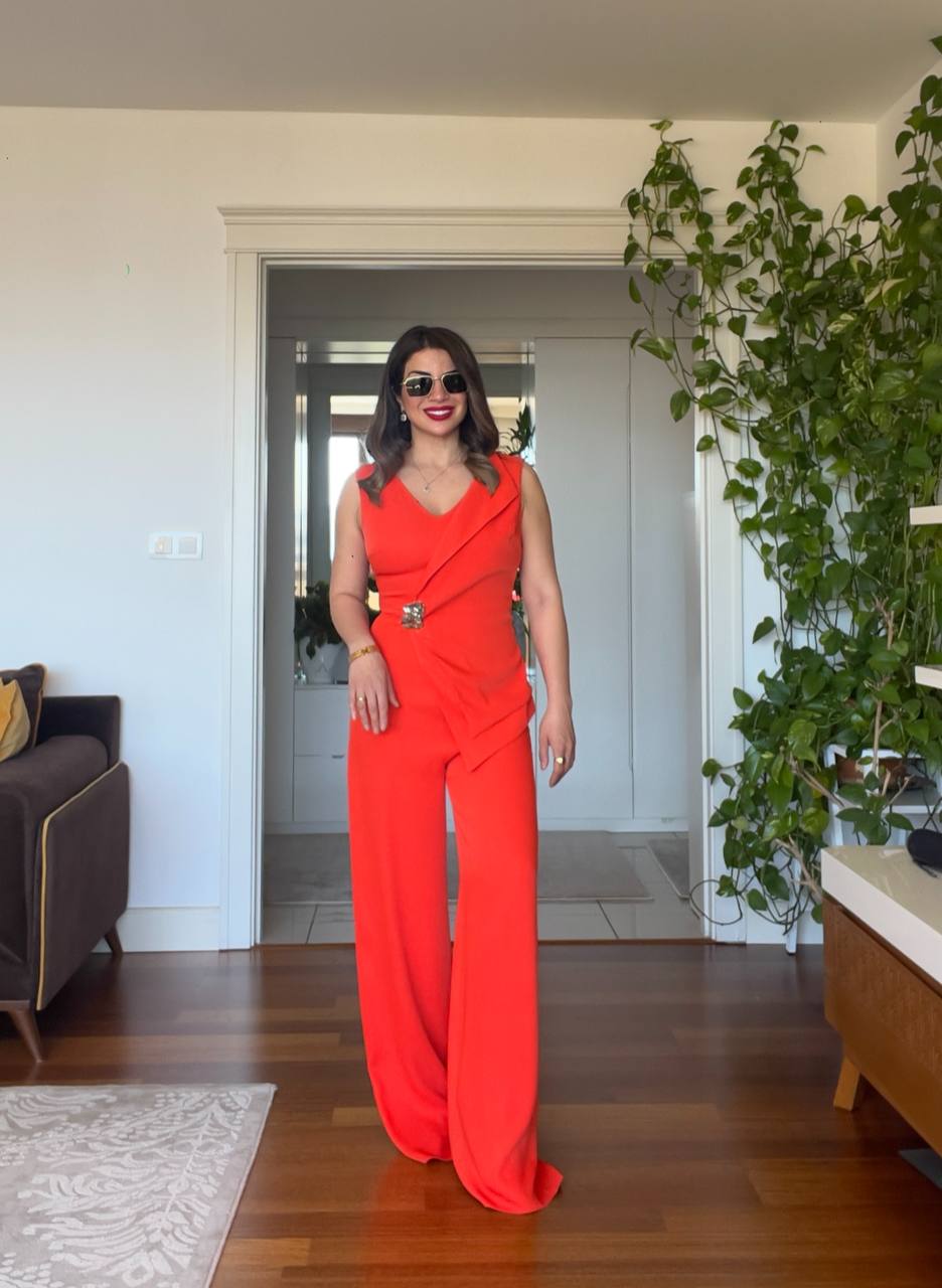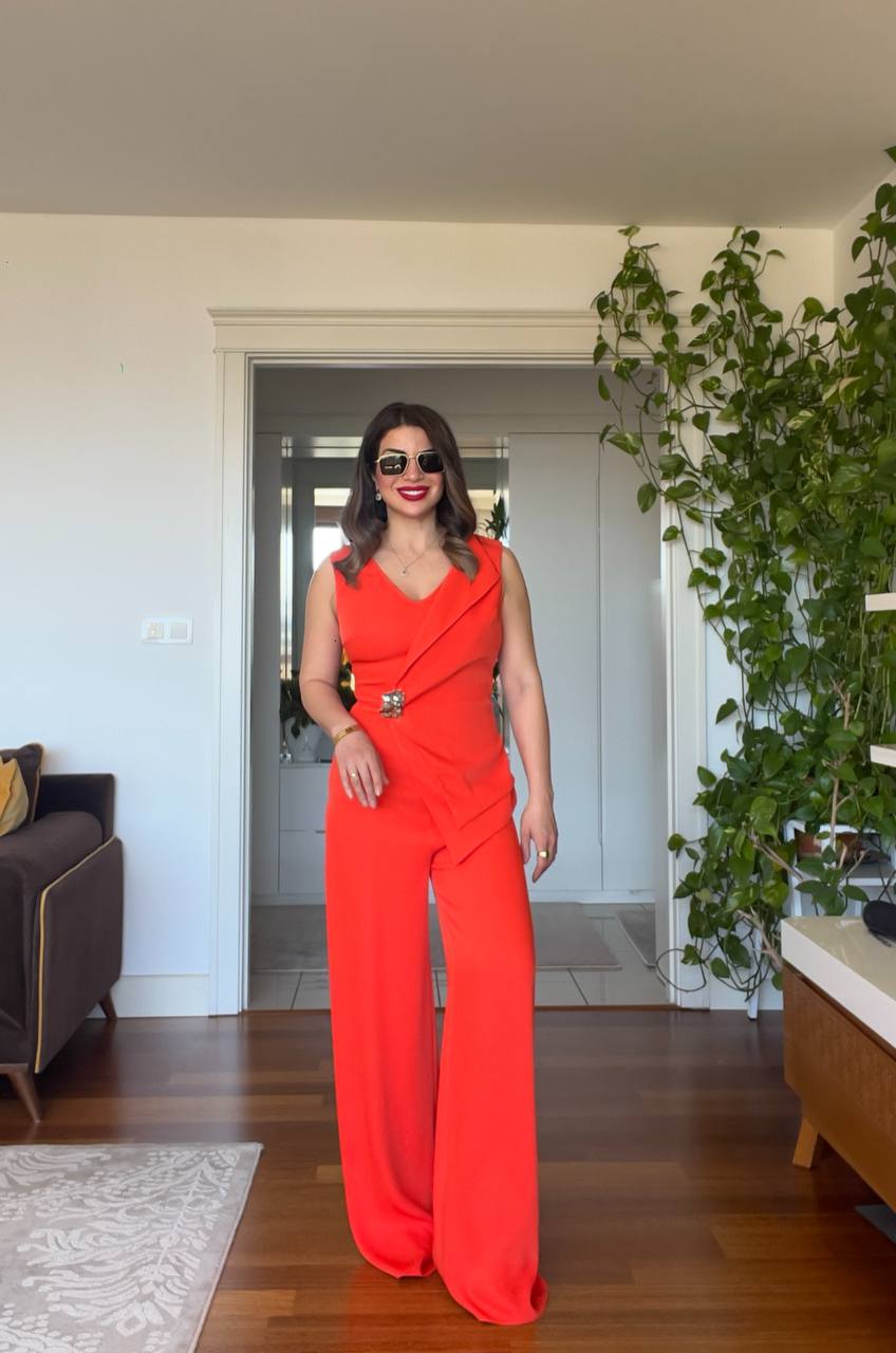 Add a bold and modern touch to your confident style with this asymmetrical red jumpsuit that perfectly blends elegance and sophistication. The gold buckle detail at the waist gracefully accentuates the silhouette while creating a strong, structured look. Made from soft, flowing fabric with a wide-leg cut, it offers both comfort and a striking appearance.