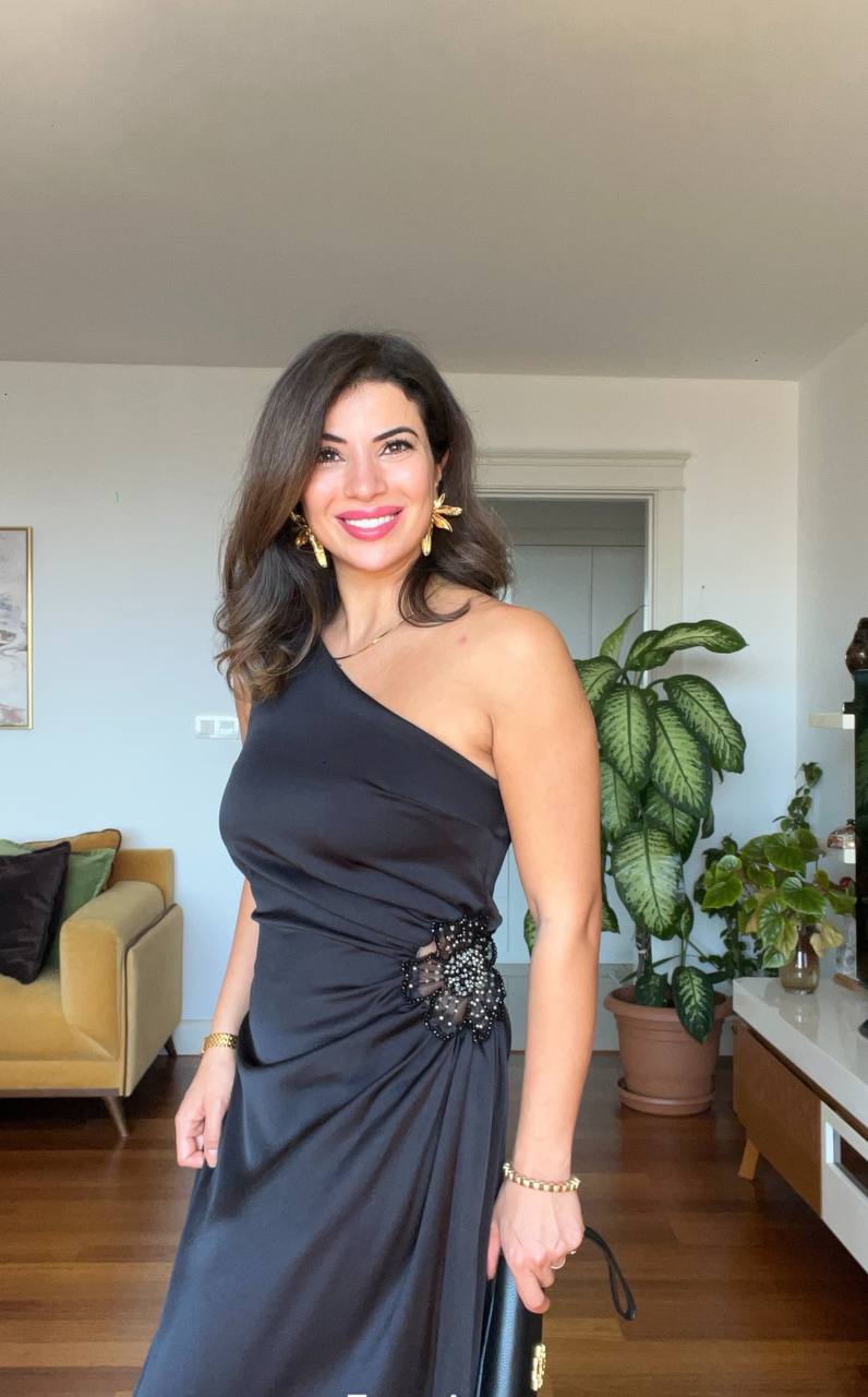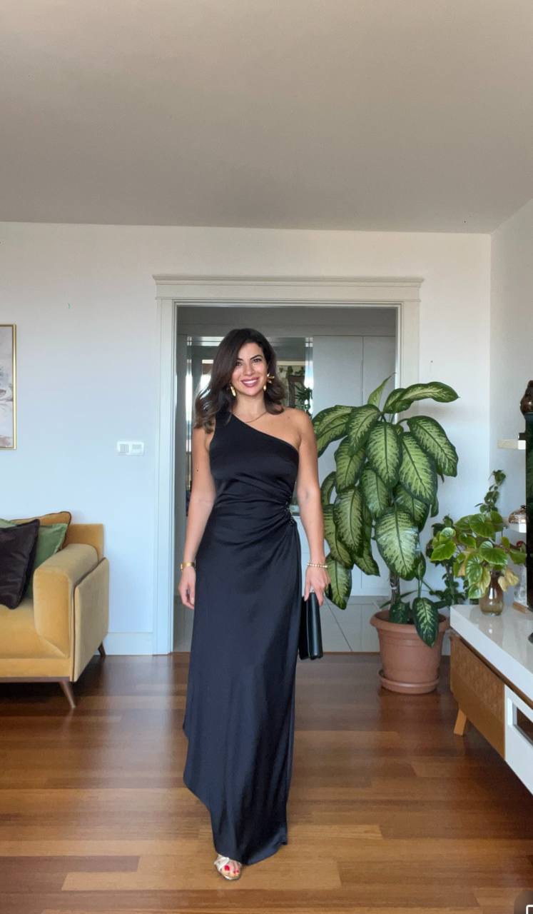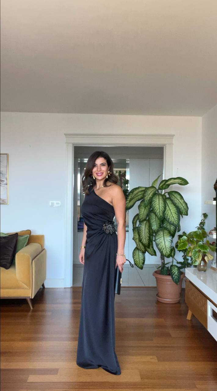 This dress presents a modern take on classic elegance. The asymmetrical shoulder detail adds the finest lines of grace, while the embroidery at the waist highlights feminine touches. Its fluid and flowing design maximizes both comfort and confidence, making you the center of attention in any setting. Reflecting the sparkle of the night, this design is on its way to becoming a fashion classic with its minimal yet dazzling style. Whether stepping into a party, the red carpet, or a special evening, be ready to make a statement with the mystery and sophistication of black. This dress will make every moment unforgettable.