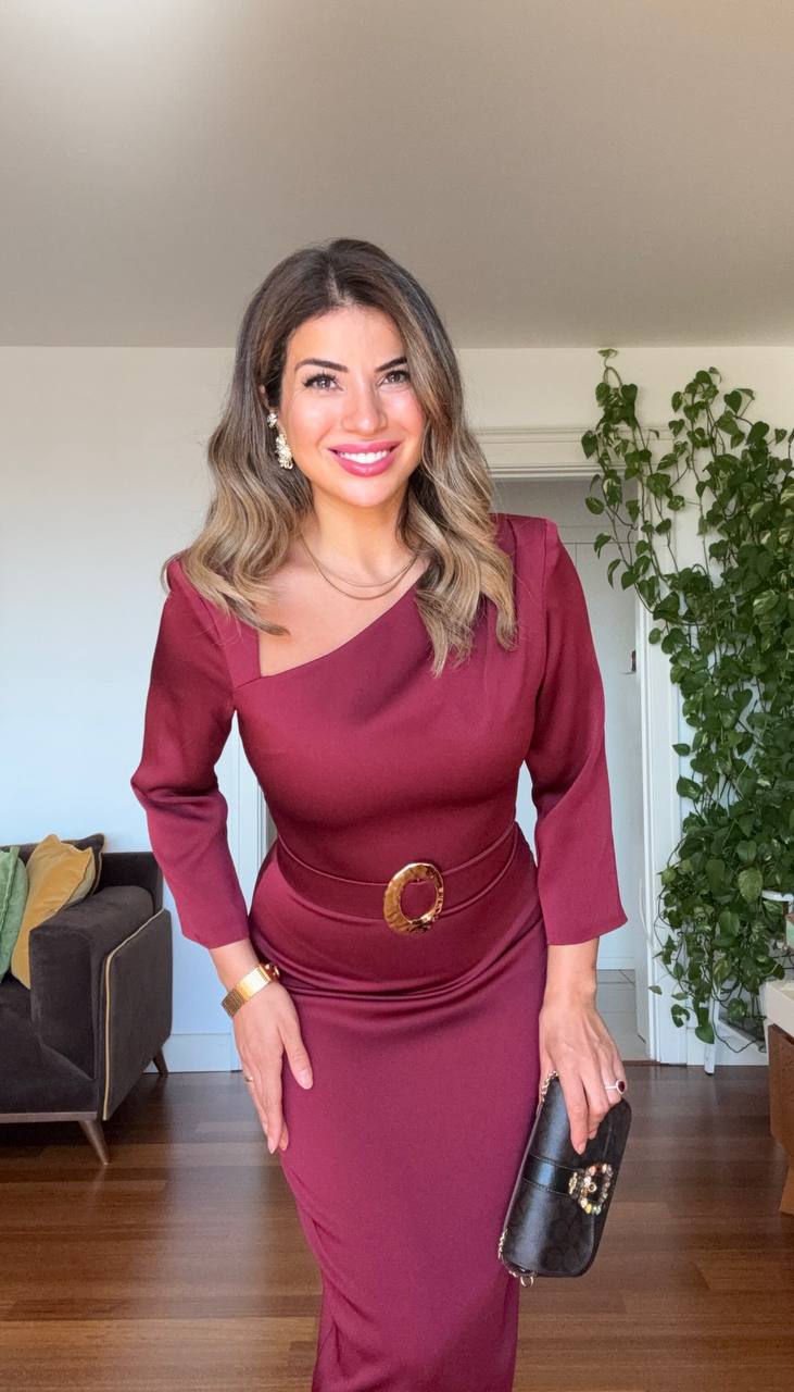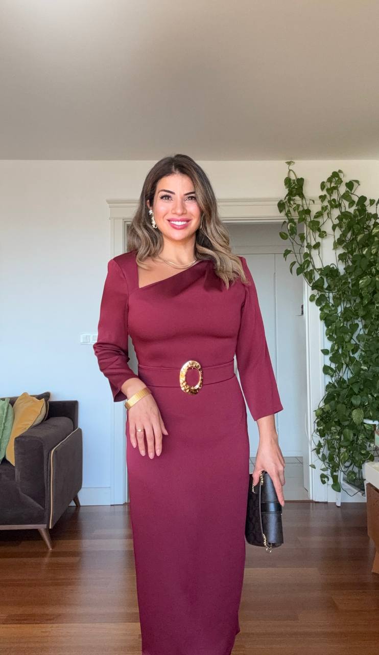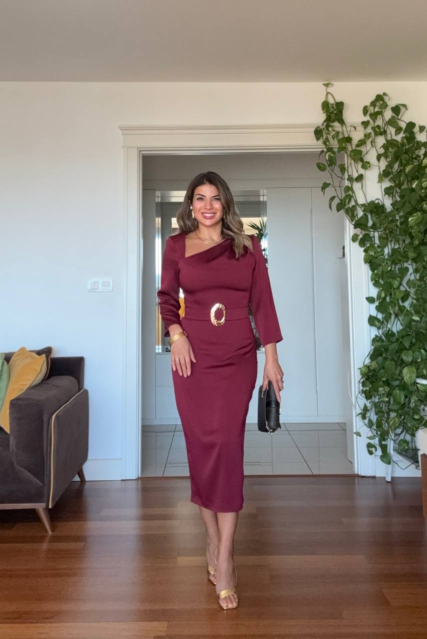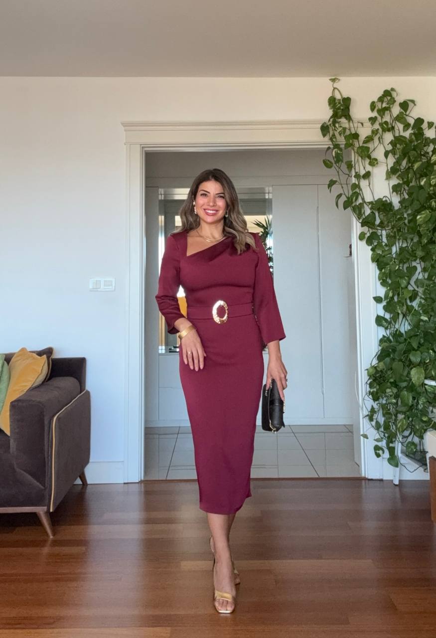 Offering an elegant and sophisticated style, the Asymmetrical Neck Satin Midi Dress with Belt Detail is designed to make you stand out at special occasions, business dinners, and evening events. Its figure-hugging satin fabric and oval-buckle belt accentuate a feminine silhouette.