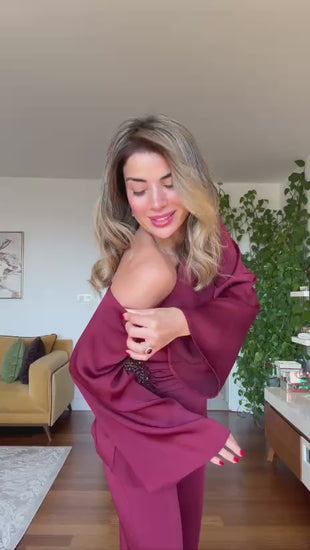 A refined interpretation of modern elegance, the ASYMMETRICAL ONE-SHOULDER EMBELLISHED SUIT – BURGUNDY ensures you make a striking impression at any event, from special occasions to elegant evening gatherings. The asymmetrical one-shoulder cut creates a feminine silhouette, while the crystal-embellished floral detail on the shoulder adds a touch of sparkle and sophistication.