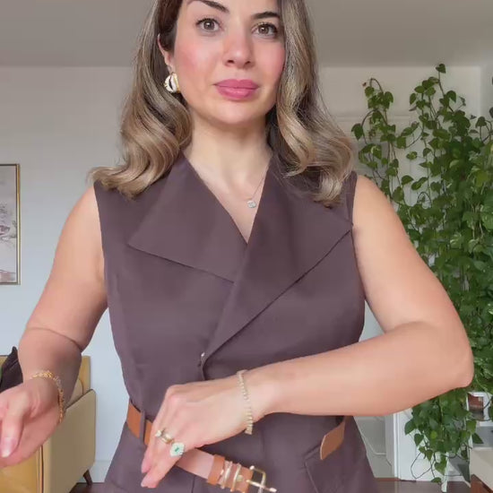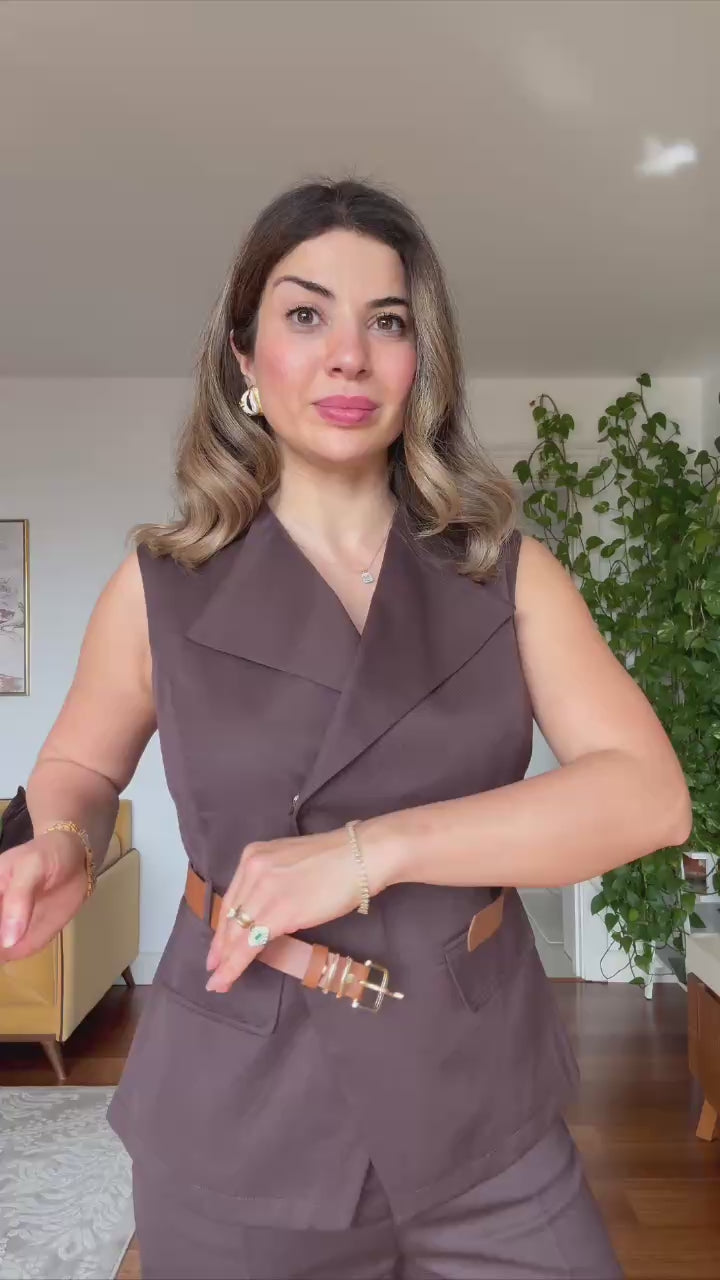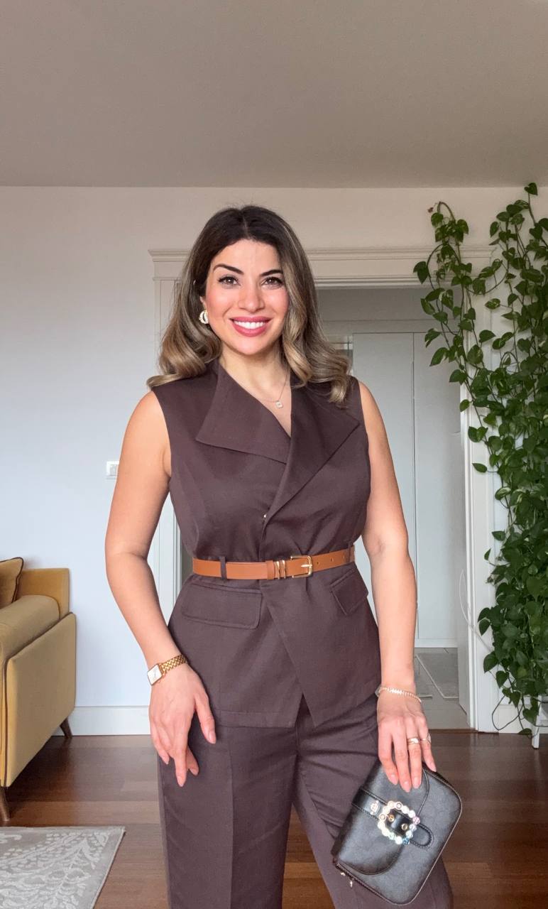 This elegant set combines modern sophistication with a strong, timeless silhouette. The double-breasted vest features a waist-defining belt detail that highlights the figure beautifully, while the matching trousers complete the look with a balanced and refined style.