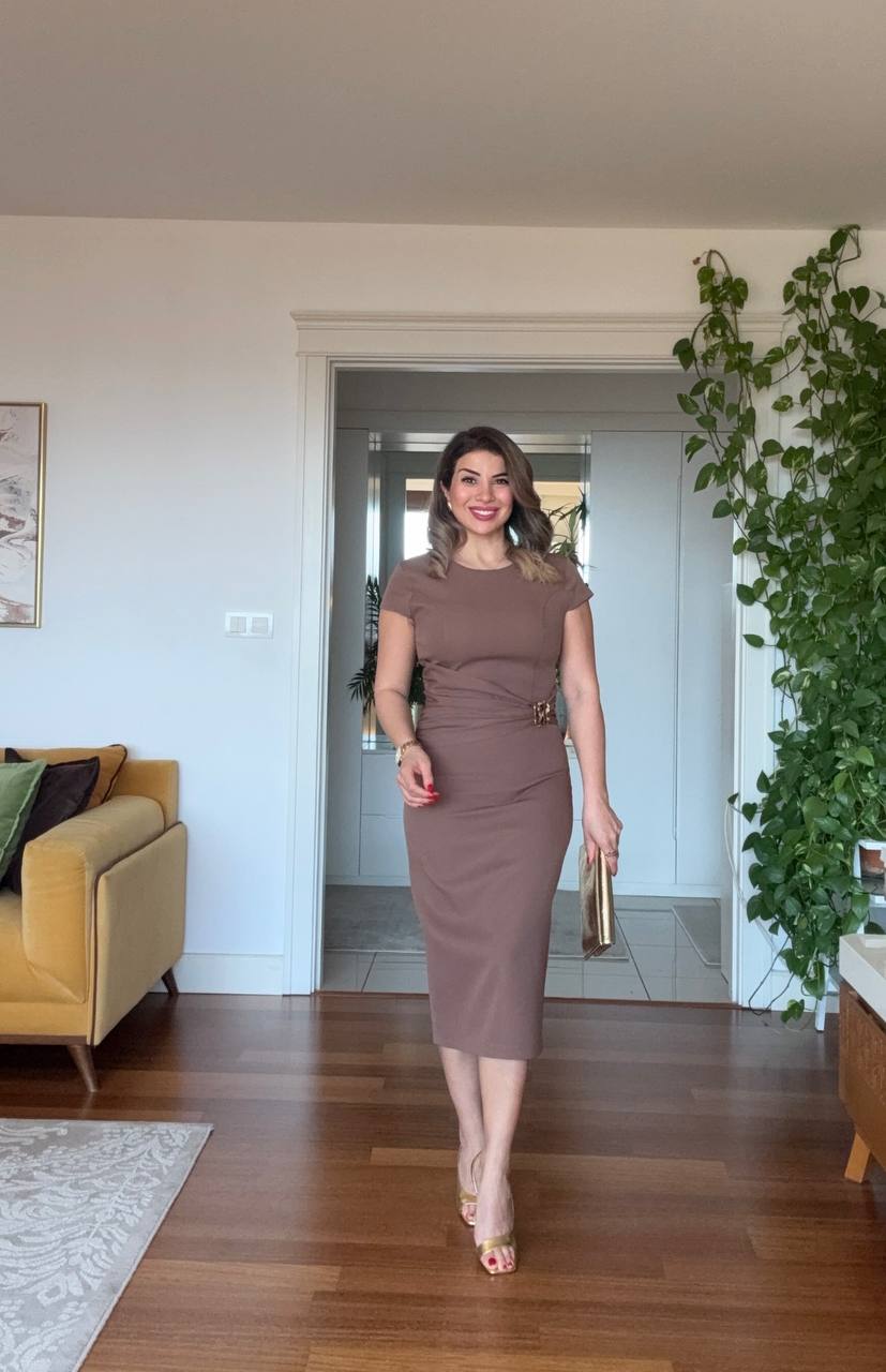 Designed to enhance your feminine silhouette, this chic midi dress features a body-contouring fit with elegant draped detailing at the waist. The gold-tone statement buckle adds a luxurious touch while beautifully accentuating the waistline.