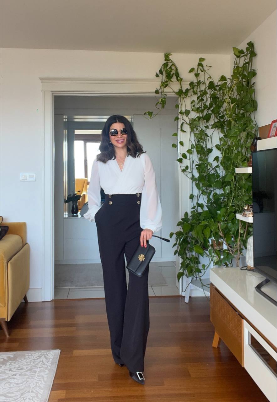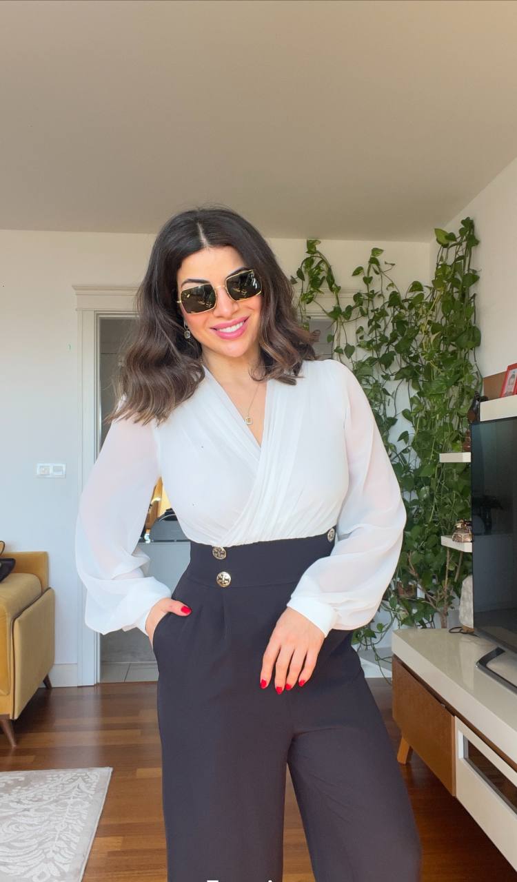 Add timeless elegance to your wardrobe! With its white draped chiffon top, this jumpsuit offers a graceful look, while the high-waisted design with gold button details brings a sophisticated touch. The wide-leg fit ensures both comfort and a modern silhouette. Perfect for elevating your daily style or shining at special events.