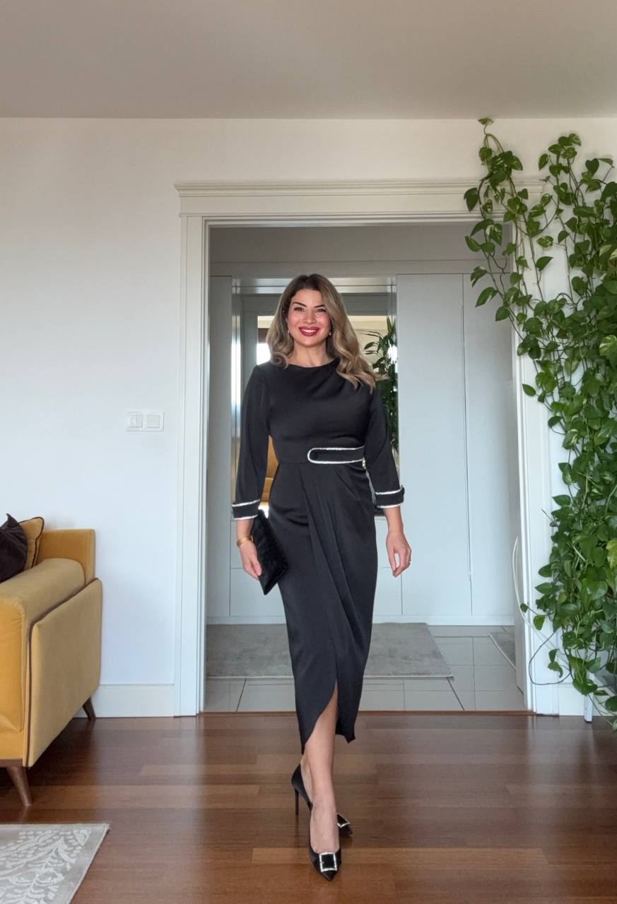 Elegance meets simplicity in this stunning black dress, designed to be a timeless staple in every modern woman’s wardrobe. The stone-detailed belt at the waist and shimmering trims on the cuffs add a sophisticated touch to its minimalist silhouette. The asymmetrical hemline creates a graceful and feminine shape, subtly accentuating your figure. Perfect for special occasions and evening events where you want to stand out with effortless elegance.