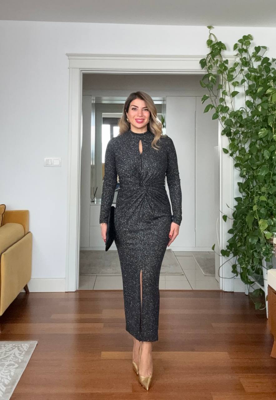 This elegant and dazzling dress is designed for women who appreciate modern sophistication. Its body-hugging silhouette, front draped details, and subtle front slit create a feminine and striking look.