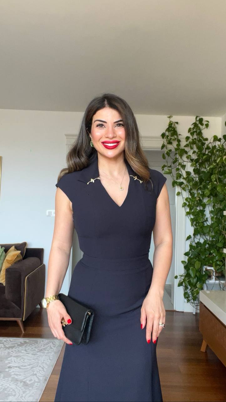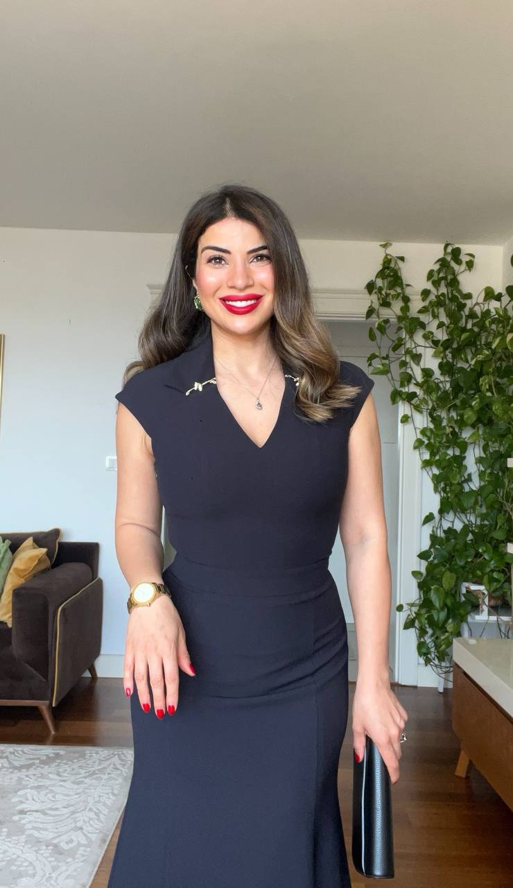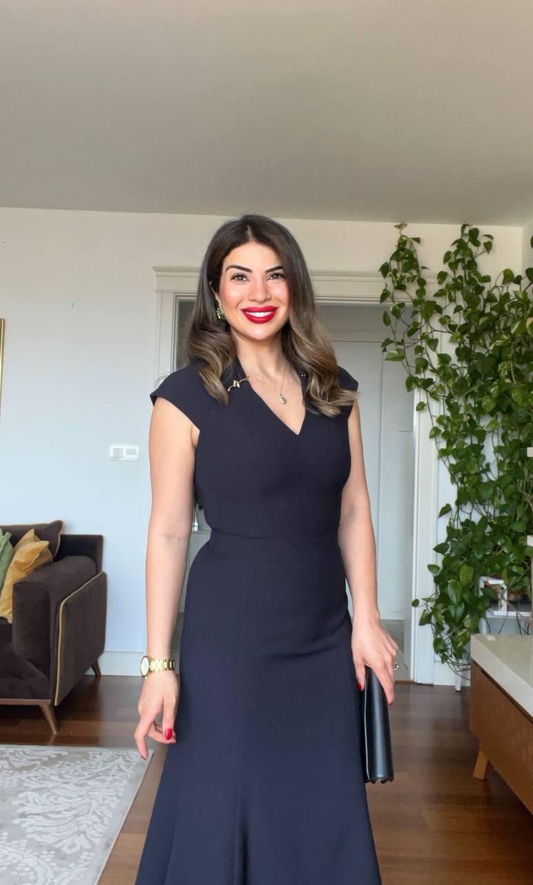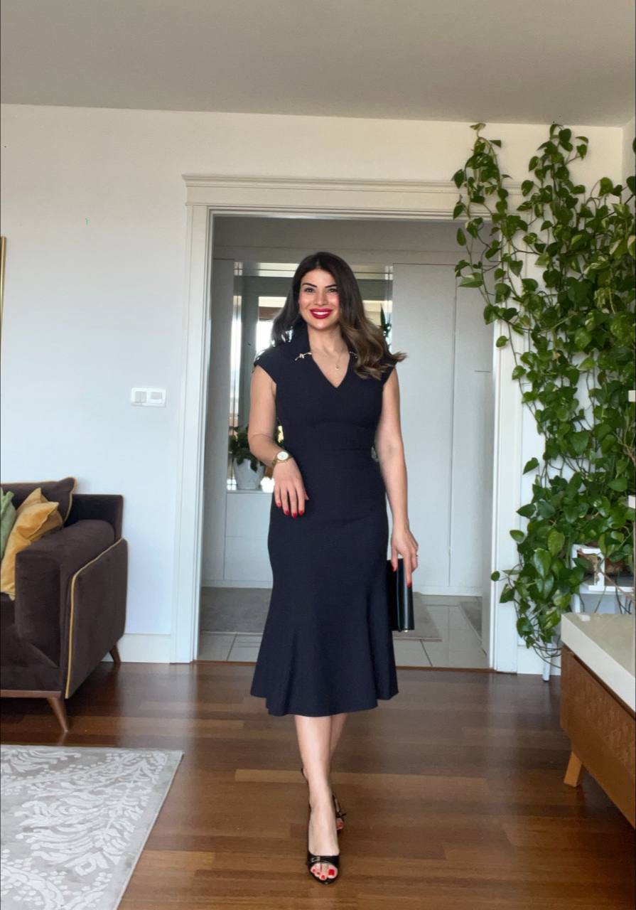 The V-neck design subtly elongates the neckline, and the lightly flared hem ensures freedom of movement. With its high-quality fabric and flawless tailoring, this dress is an ideal choice for everything from formal events to stylish office looks.