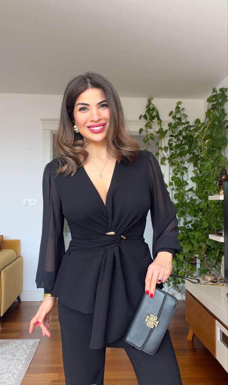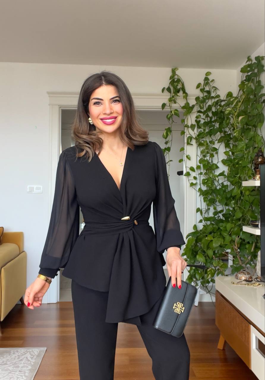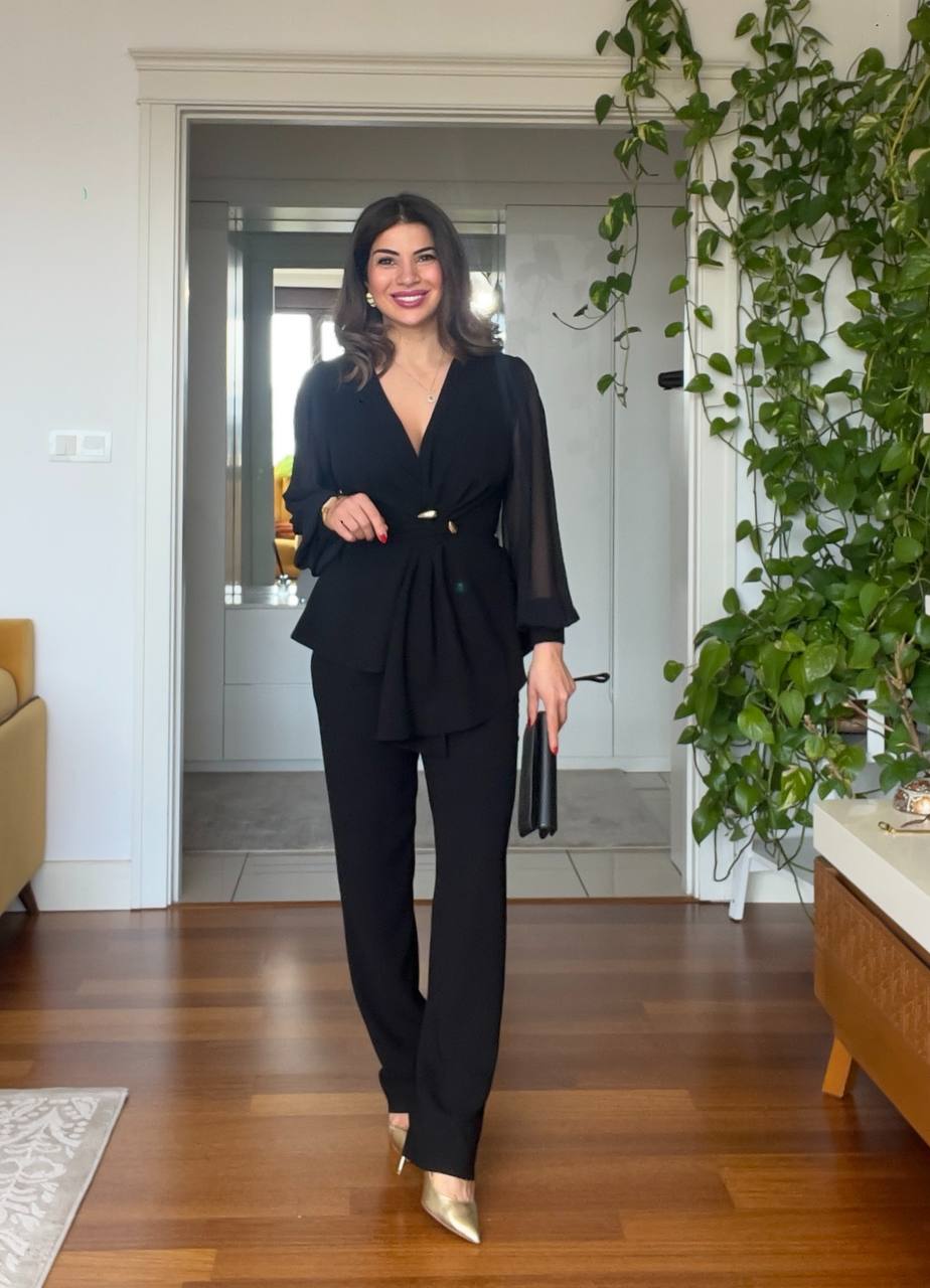 This set pairs beautifully with classic high heels and a stylish handbag. For a casual chic look, it can also be effortlessly combined with sandals. When choosing accessories, opt for simple and elegant pieces to highlight the set.