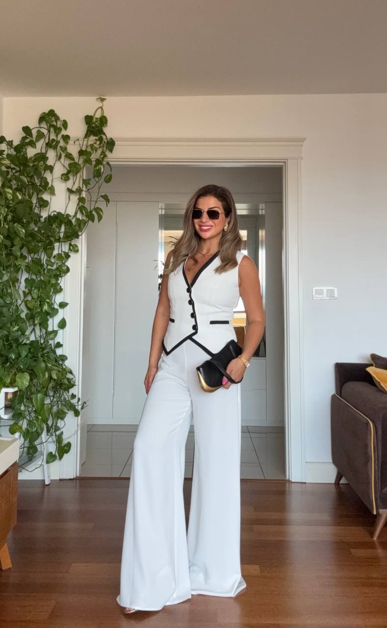 With its refined silhouette and modern lines, this white suit is poised to become a staple in your wardrobe. The sleeveless blazer-style top stands out with bold buttons and white contrast trims, adding a sophisticated edge, while the wide-leg trousers offer comfort and ease of movement.