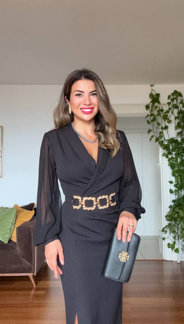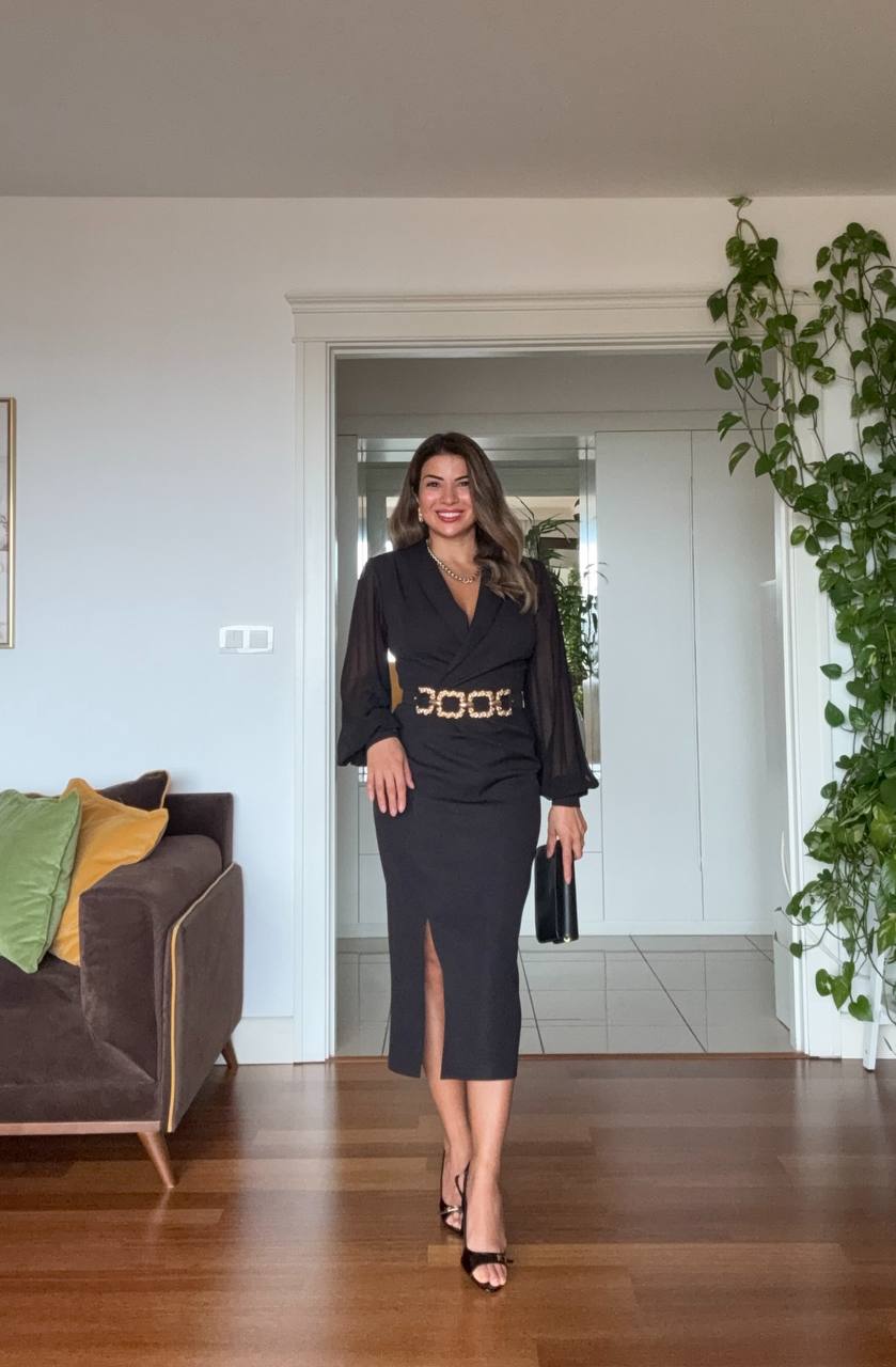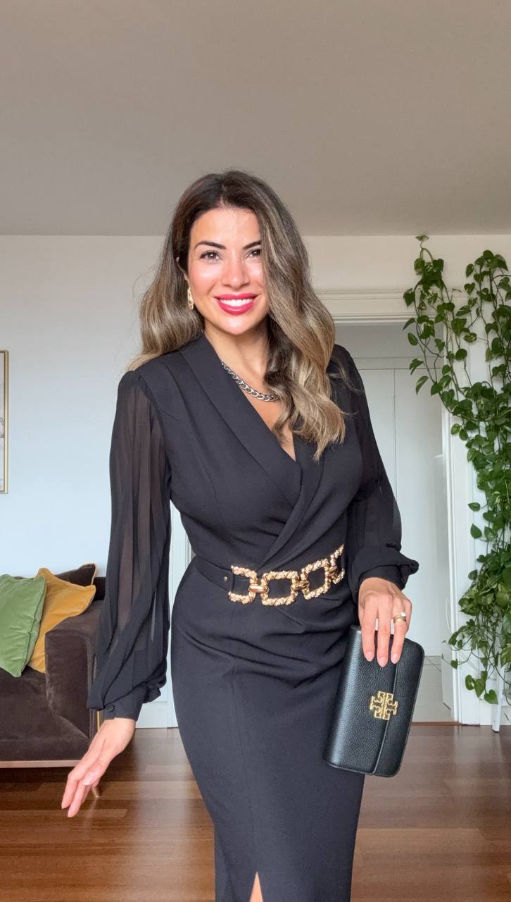 Designed for women seeking an elegant and powerful style, the Chain Belt Detailed Black Midi Dress with Chiffon Sleeves highlights your sophistication at any occasion, from special events to business dinners.