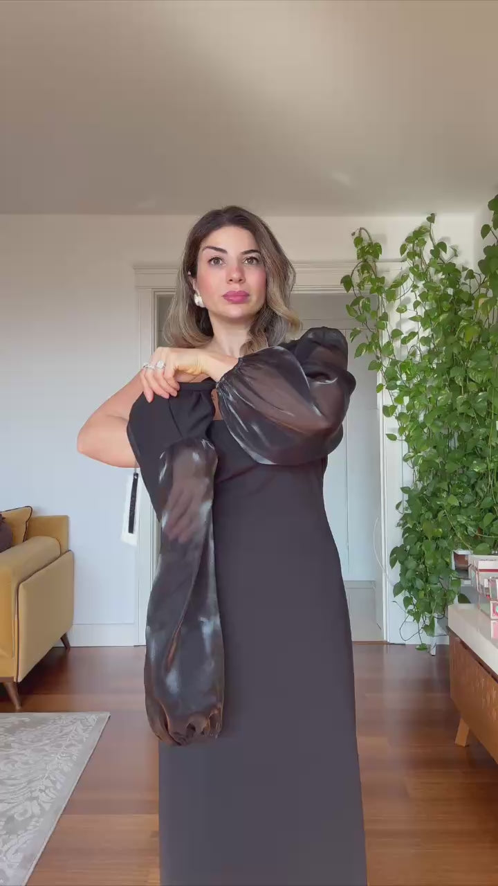 Designed with modern details, this black maxi dress offers a feminine and sophisticated look. The sheer chiffon balloon sleeves, elegant cross-neck detail, and waist belt perfectly enhance your figure.