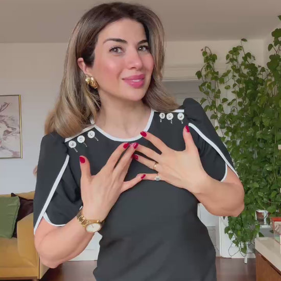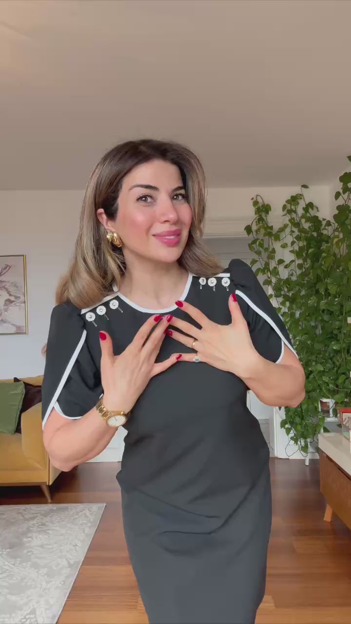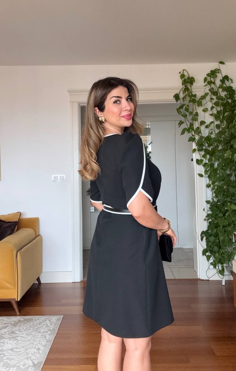 .Combining timeless elegance with modern details, this black midi dress is designed for women who seek a strong and refined style. The contrast trim adds a sophisticated touch, while the belted waist with a buckle beautifully accentuates the silhouette.