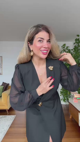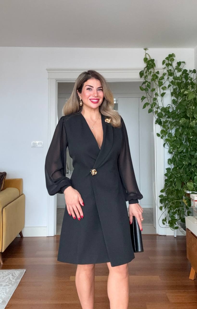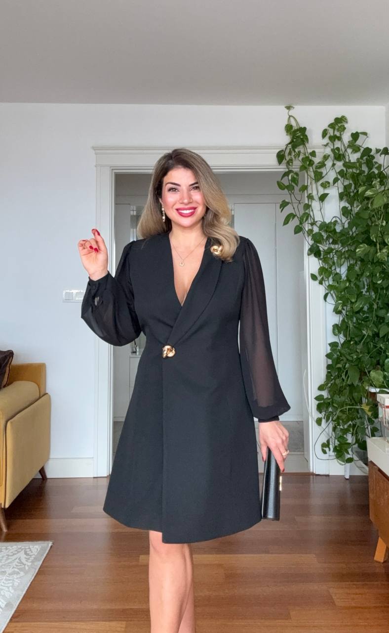 With its elegant design and modern details, this white dress is a staple every woman should have in her wardrobe. Its soft fabric offers comfort while the golden accent on the front highlights your sophistication. Featuring stylish balloon sleeves, this dress is the perfect choice for any special occasion.