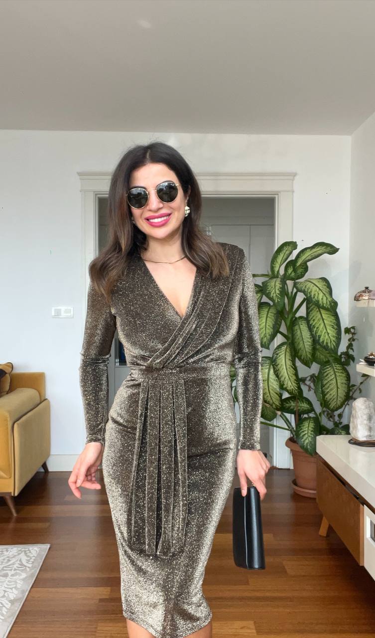 With its eye-catching khaki color and shimmering texture, this dress will make you the center of attention in any setting! Its silhouette, which delicately highlights the body's curves, offers both elegance and comfort. The long sleeves and tie detail at the waist provide a sophisticated look, making it a piece that can be worn in any season.