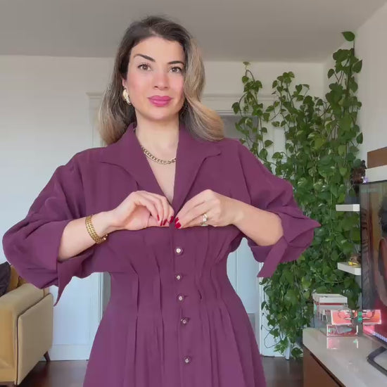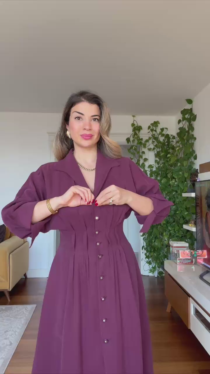 The front button closure adds a classic touch to the dress, while the midi length makes it suitable for both daytime and evening looks. The long-sleeve design offers ideal wear during seasonal transitions. The pocketed structure adds functionality alongside elegance.