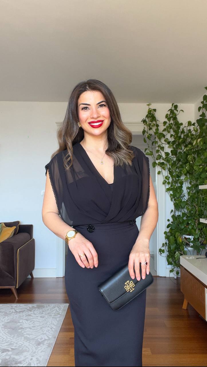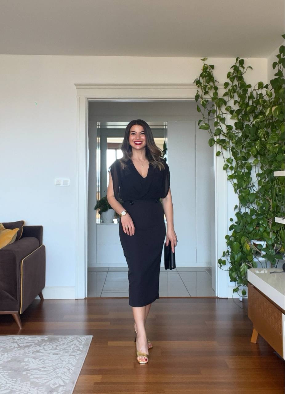 Blending feminine elegance with a modern touch, this black pencil dress is designed to make you shine on your special days. The draped chiffon top softly flows into the waistline, while the form-fitting silhouette and delicate button details offer a flawless look. Its midi length ensures a sophisticated style for both chic events and formal occasions.