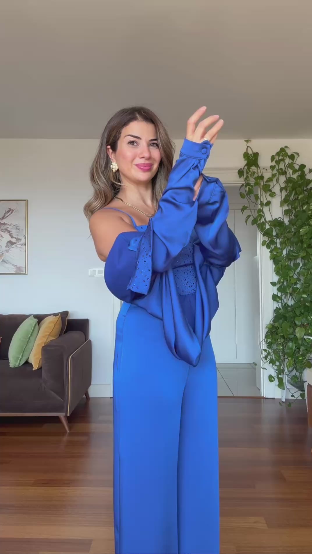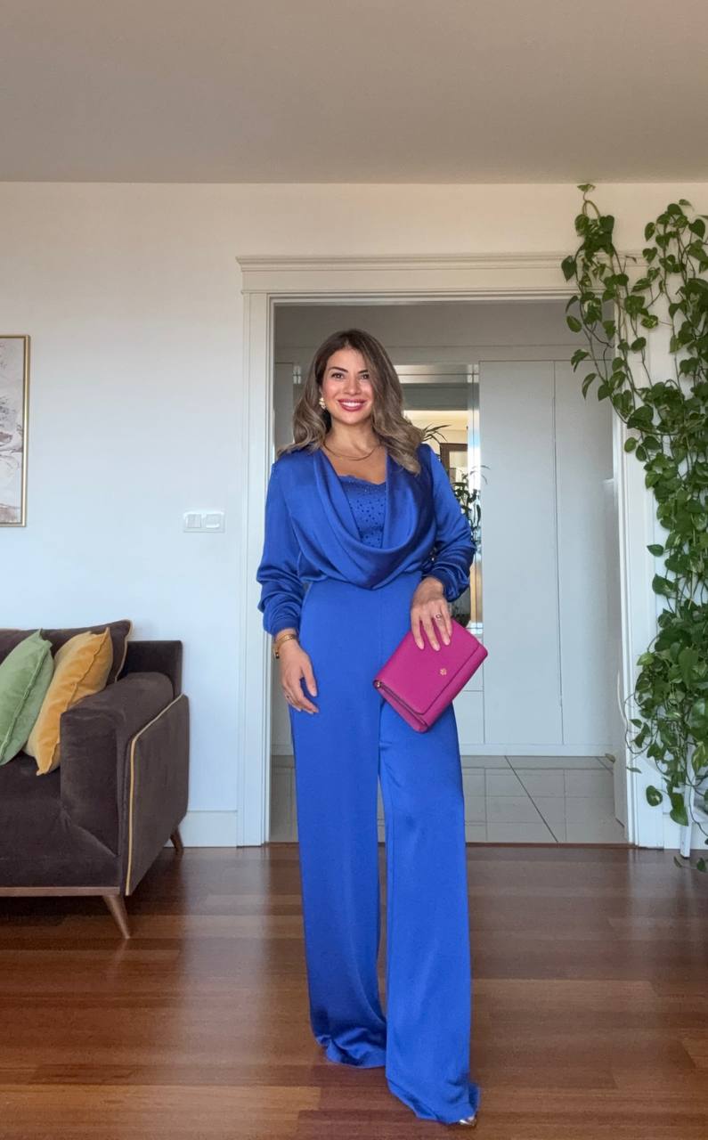 With its modern lines and sophisticated design, the Elegant Draped Neck Jumpsuit with Sequin Detail ensures a powerful and chic look, perfect for special occasions and evening events.