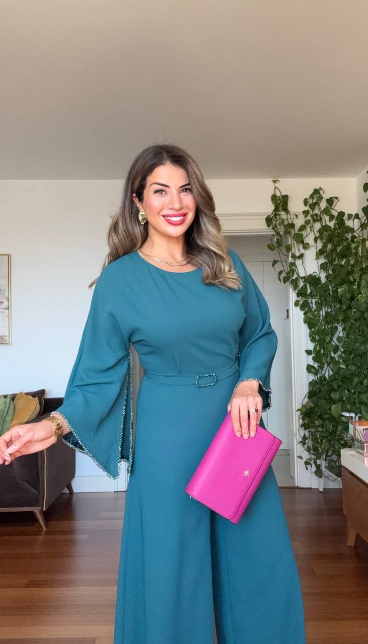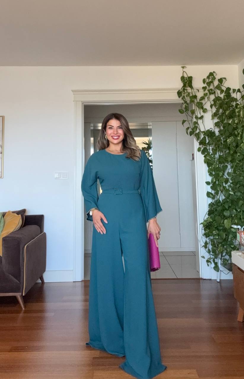 Combining modern lines with refined details, this petrol blue jumpsuit highlights your style both in everyday chic and at special occasions.