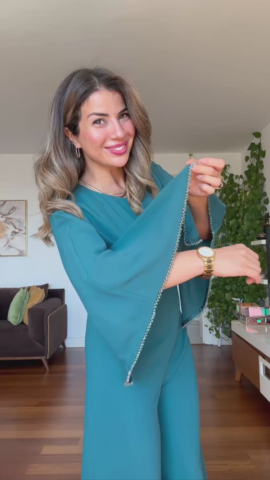 • Sleeve Detail: Wide long sleeves adorned with stone embellishments add a sophisticated touch.