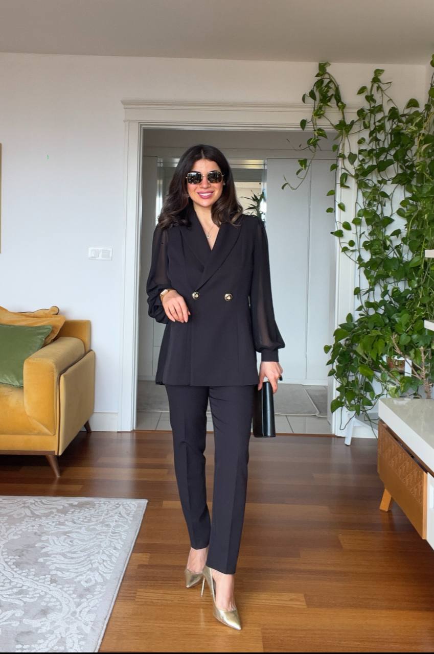 This elegant pleated back set captivates with its sophistication and modern look, making it the perfect piece to wear in any season. It seamlessly adapts to various outfits, from casual chic to office style. With its soft texture, it offers comfortable wear, while the pleated details add movement.