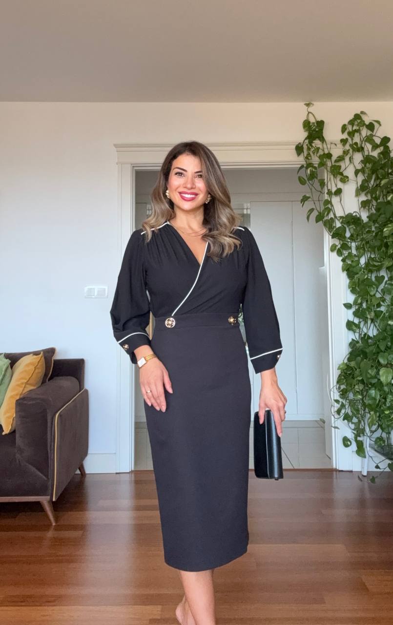 Combining modern business elegance with timeless sophistication, the Elegant V-Neck Button Detail Pencil Dress is the perfect choice for both office settings and special occasions. The wrap-style V-neckline and slightly pleated sleeves add a feminine touch, while the high-waist cut with gold button details enhances a refined silhouette.