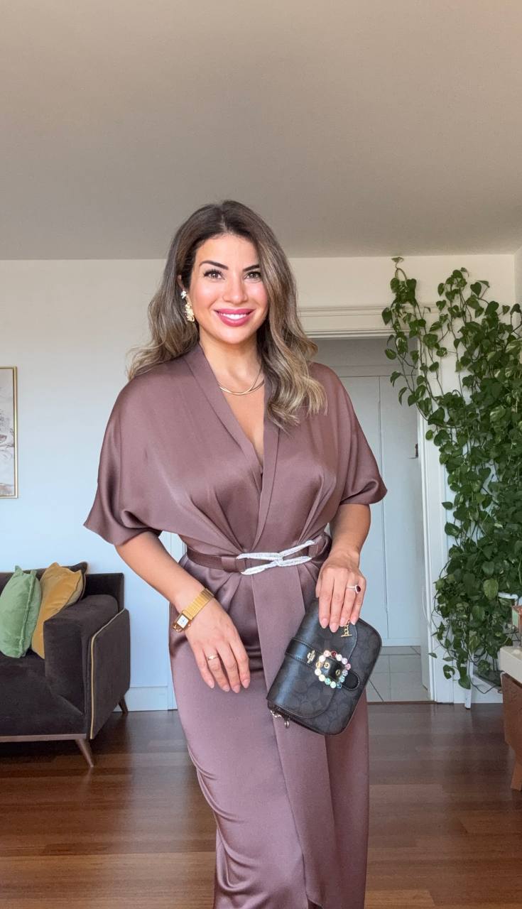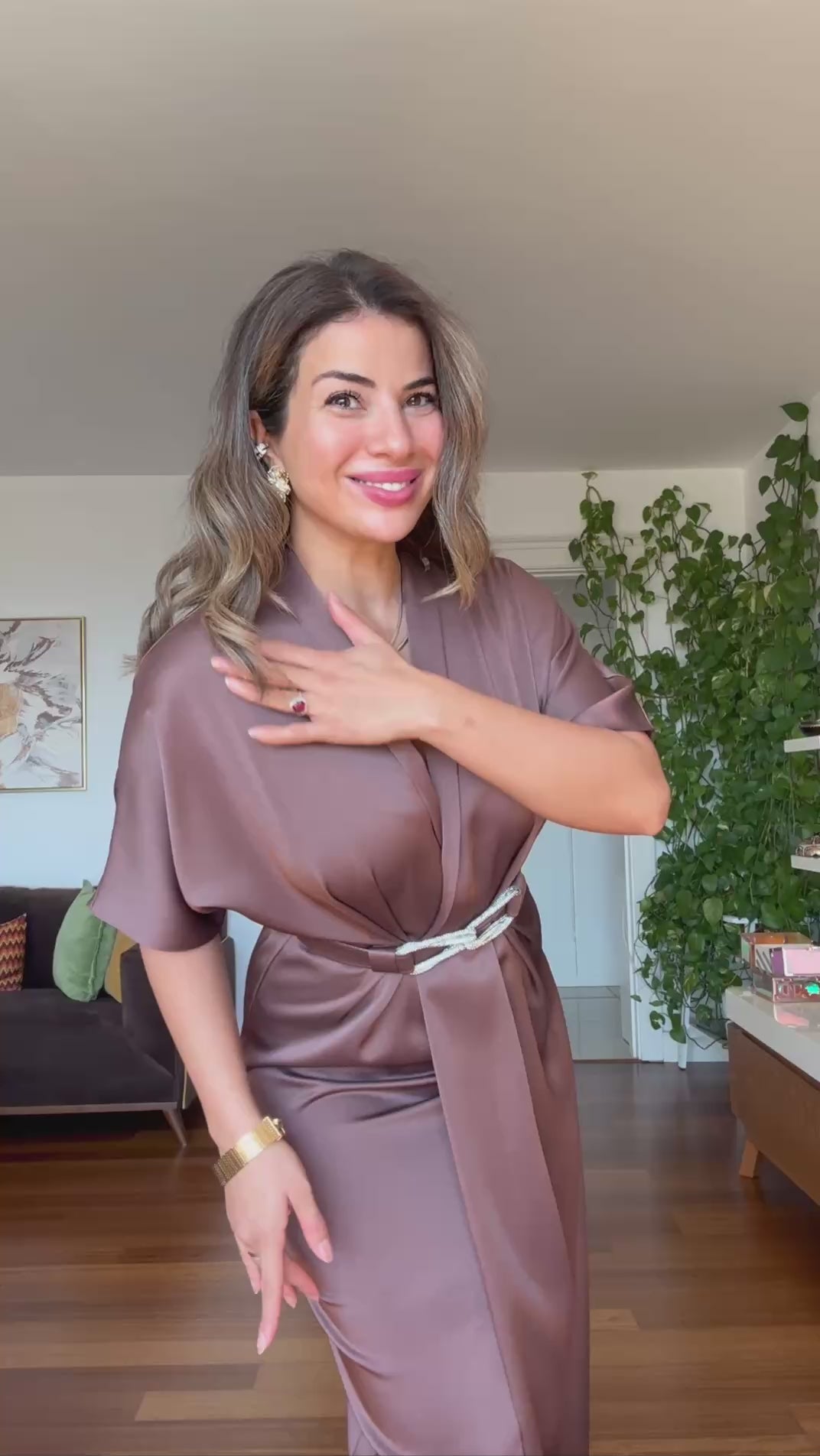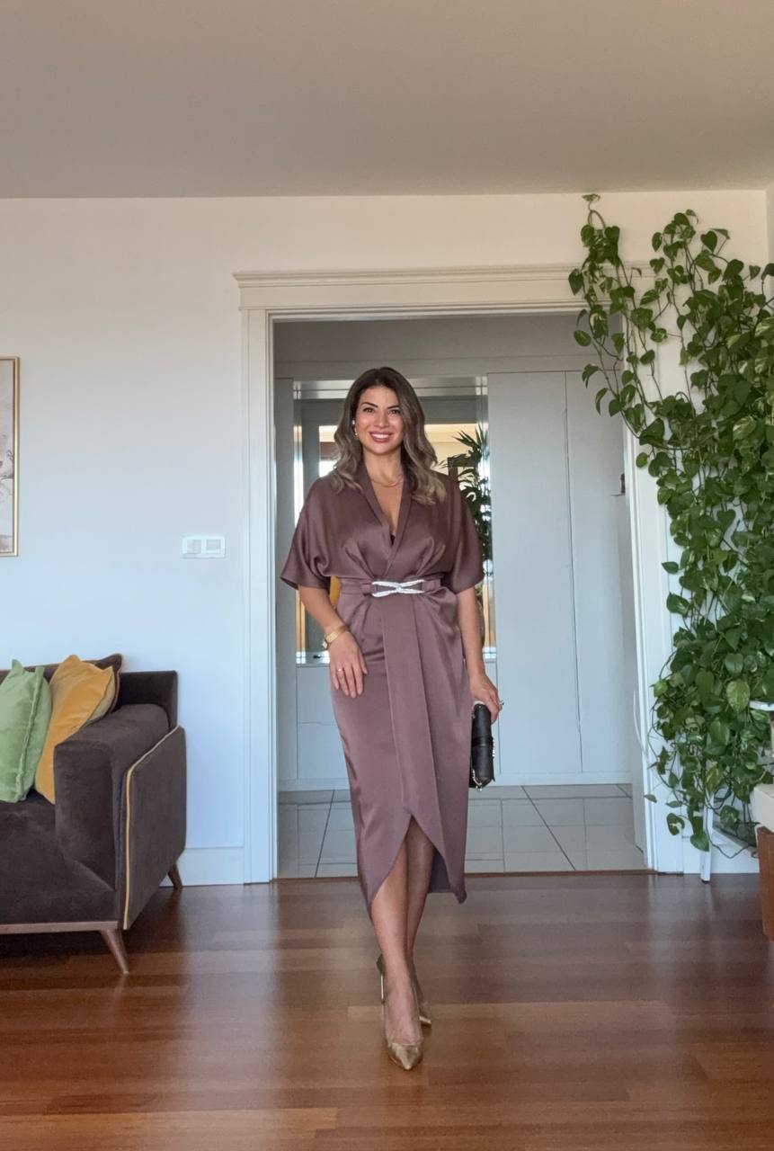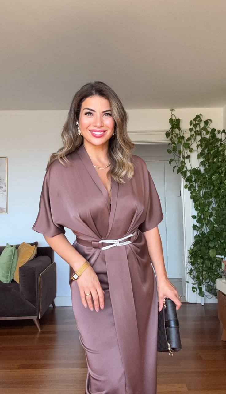 Experience timeless elegance with this mocha brown satin dress, designed to make you stand out at evening events, dinner parties, or special occasions. Its flowing fabric and relaxed fit provide all-day comfort, while the sparkling belt detail accentuates the waist, adding a feminine and sophisticated touch.