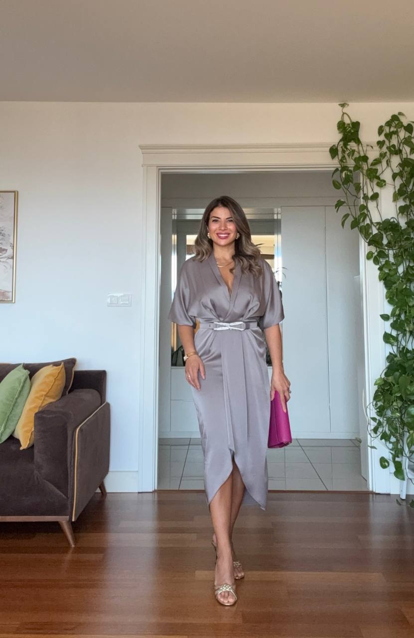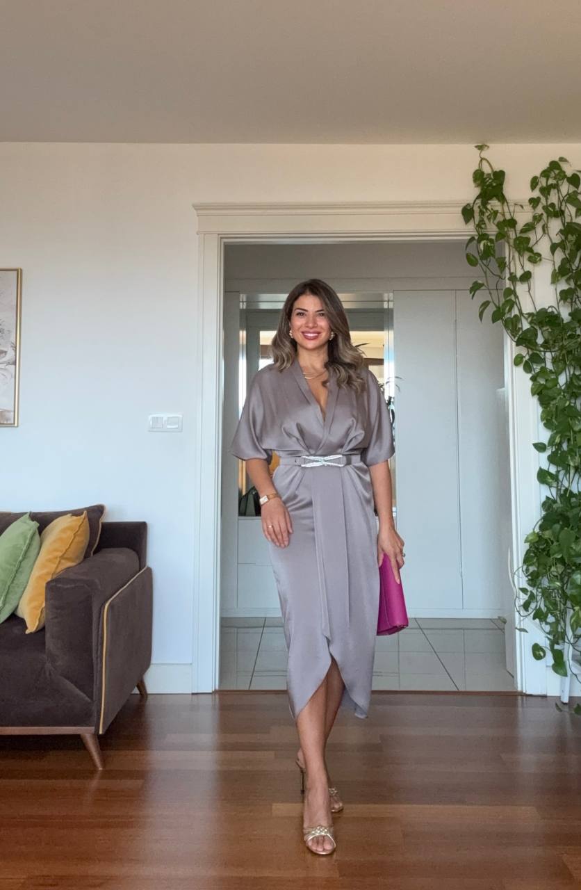 Experience timeless elegance with this mink satin dress, designed to make you stand out at evening events, dinner parties, or special occasions. Its flowing fabric and relaxed fit provide all-day comfort, while the sparkling belt detail accentuates the waist, adding a feminine and sophisticated touch.