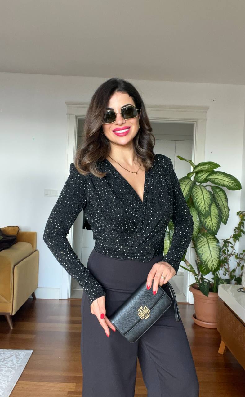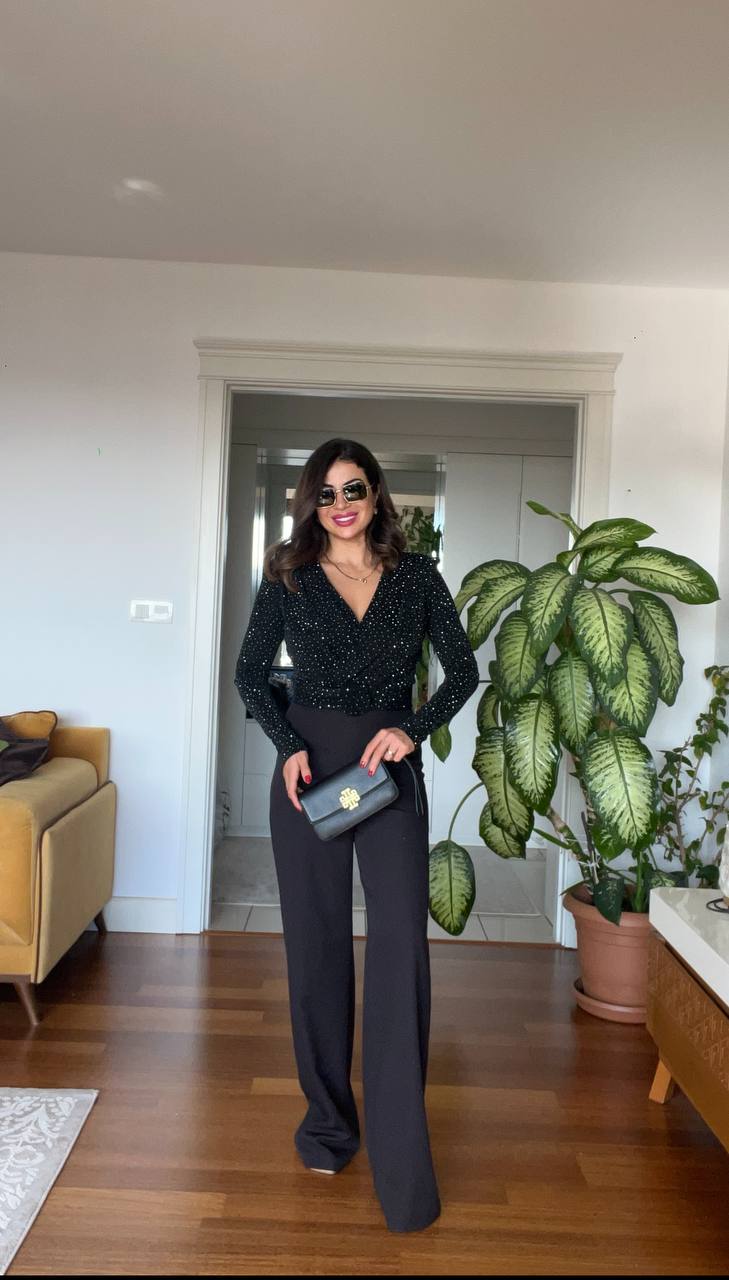 This elegant jumpsuit brings together sophisticated style and comfort. Its fabric, adorned with shimmering details, helps you shine at special events or evening parties, while its figure-hugging design emphasizes elegance. The high waist and wide-leg cut create both a graceful and modern silhouette. The V-neck detail adds a feminine touch, giving extra refinement to your look.