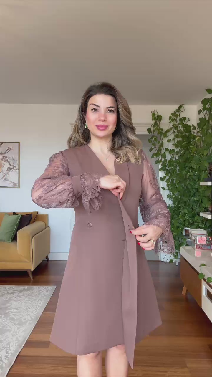 Bringing together modern and feminine lines, this brown dress offers a sophisticated look with its wrap-style cut and gold button details. The sheer lace long sleeves add a romantic touch, while the A-line silhouette enhances the figure in a balanced and graceful way.