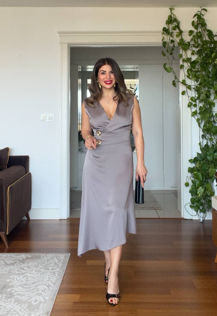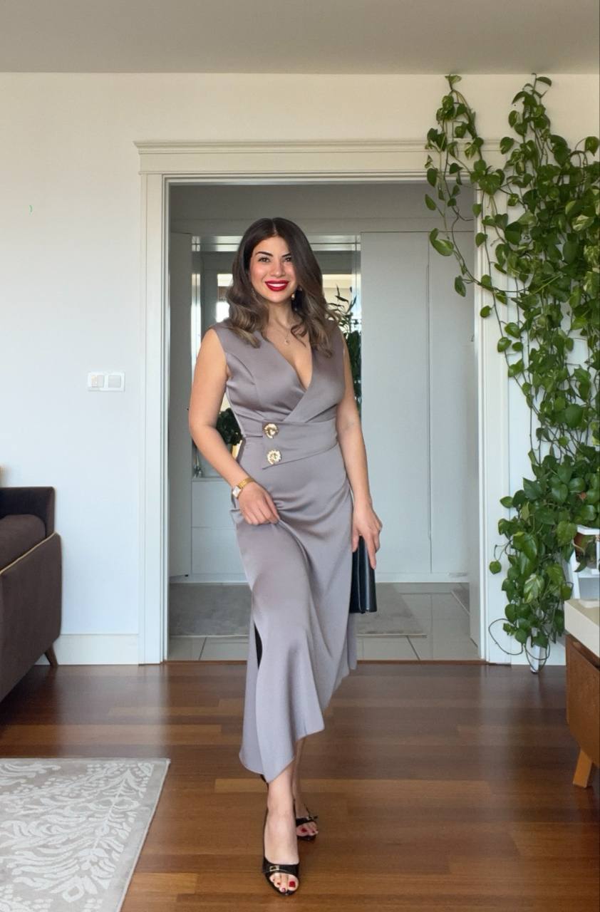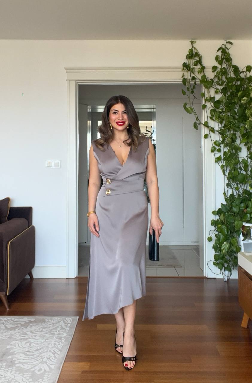 Designed for women who seek a bold yet elegant look, this mink dress highlights sophistication with its wrap-style neckline and figure-flattering silhouette. The gold-toned decorative buttons add a refined touch, while the high-quality fabric ensures all-day comfort.