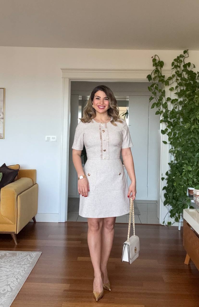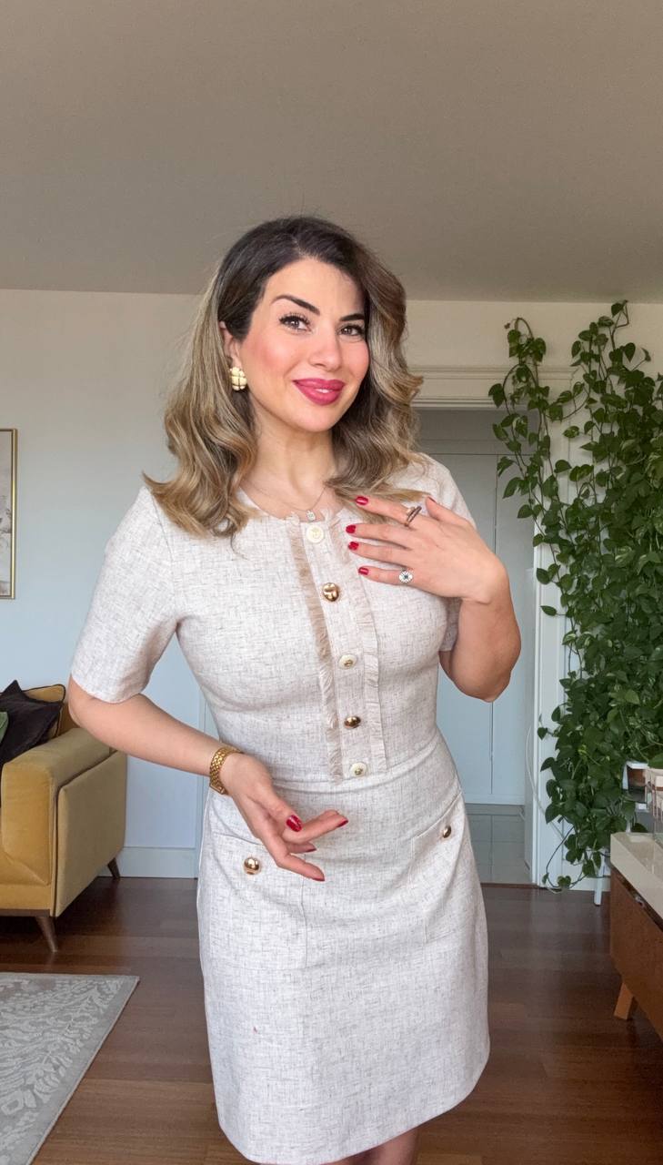 Featuring a natural linen-textured fabric and refined gold button details, this beige mini dress offers a look that is both simple and powerful. Its tailored waist and gently flared A-line silhouette create a feminine and balanced shape.