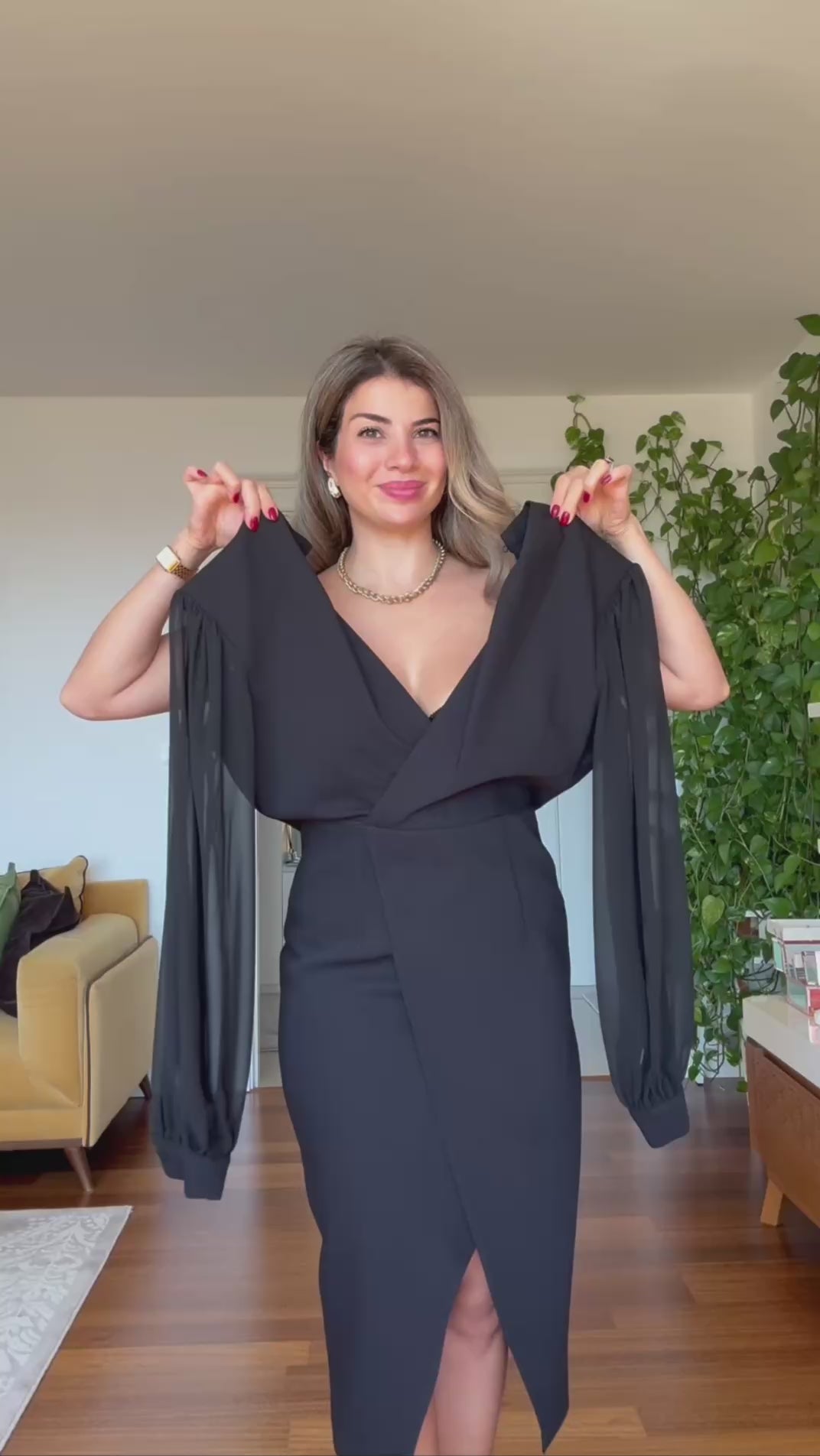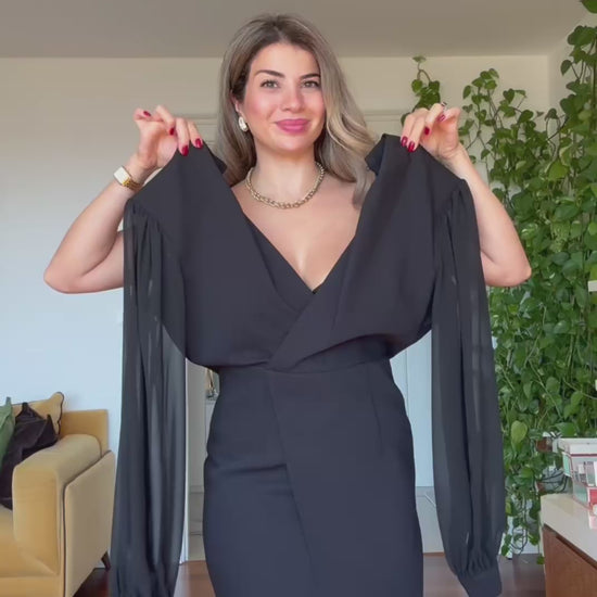 This elegant wrap dress combines sophistication and confidence in one stunning design. The gold chain belt accentuates the waist beautifully, while the wrap cut flatters the body’s natural silhouette. Sheer chiffon sleeves add a touch of femininity and timeless elegance.