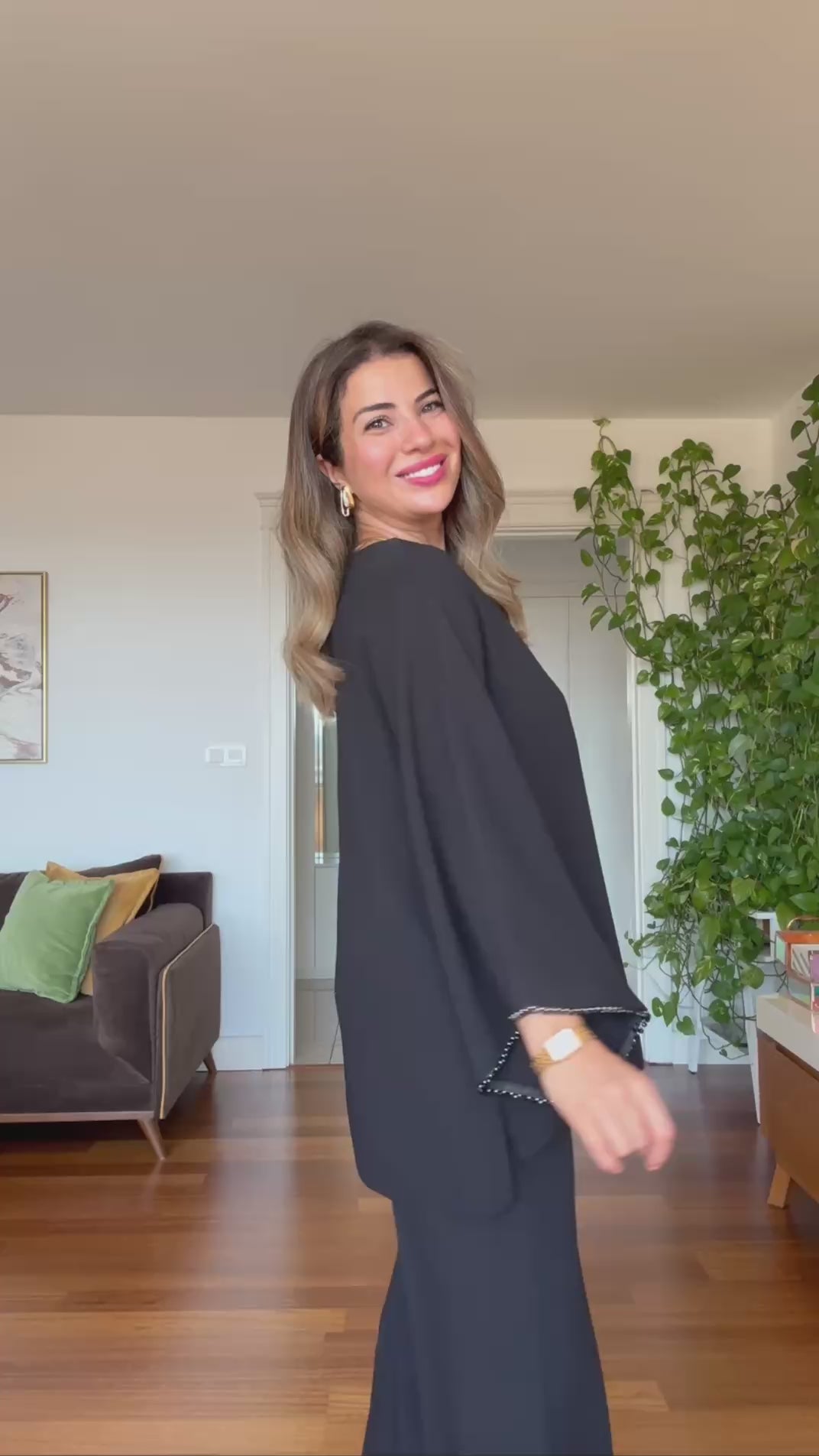 Combining elegance and comfort, this black suit stands out in any setting with its modern cut and eye-catching details. The top features wide, pearl-trimmed bell sleeves for a feminine touch, while the slim belt at the waist creates a flattering silhouette. The wide-leg trousers ensure all-day comfort and effortless style.