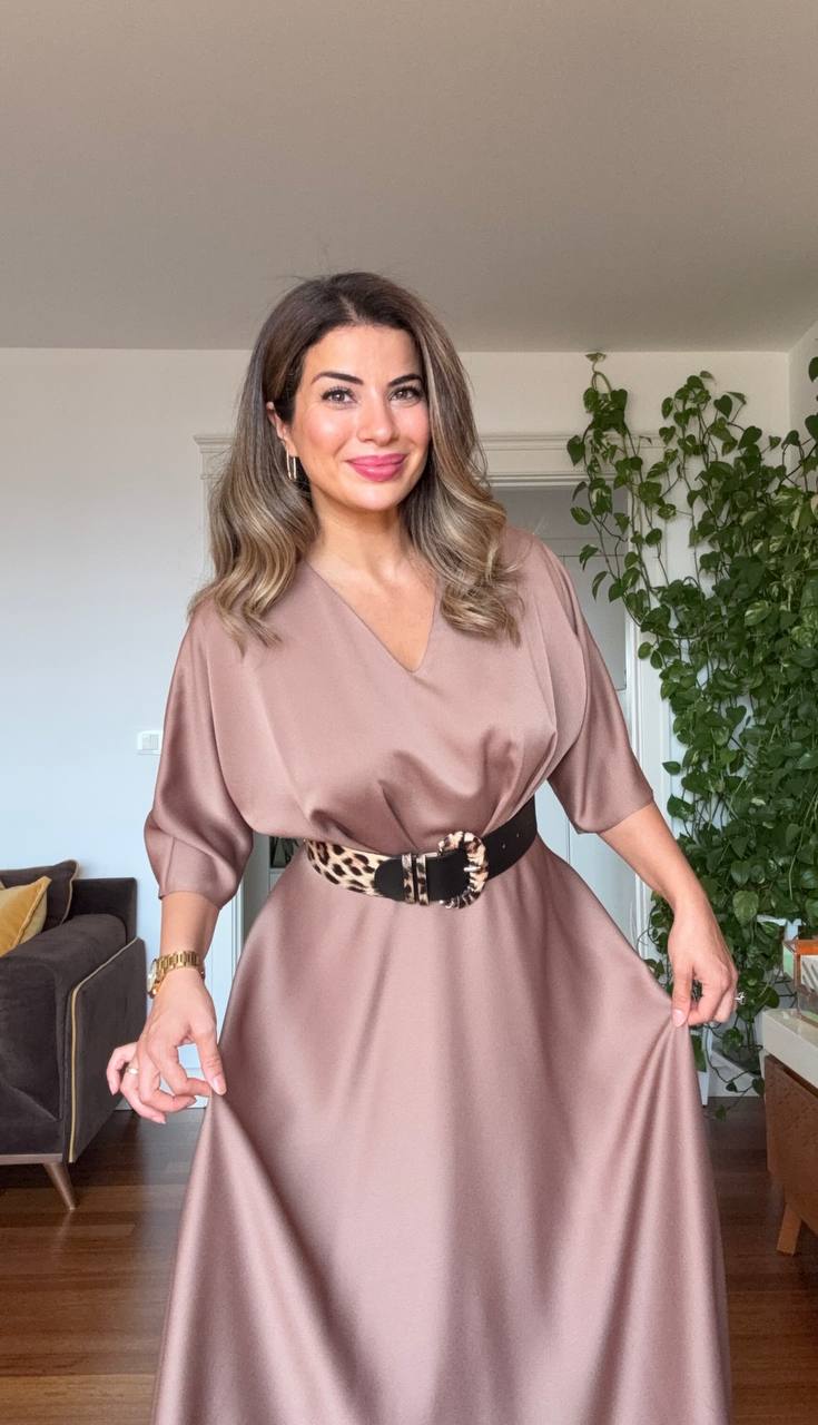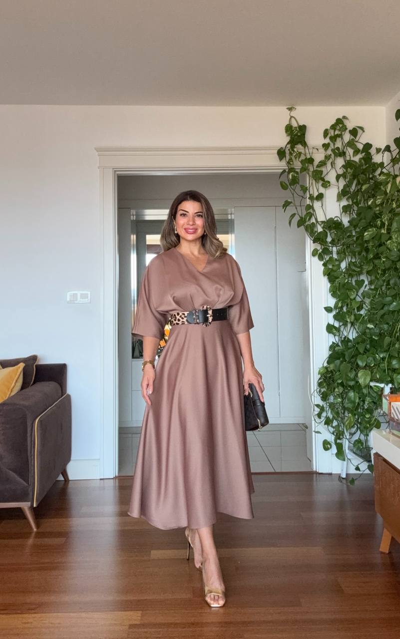 This elegant dusty rose satin dress combines modern sophistication with chic details. Its flowing fabric and shiny texture provide comfort throughout the day, while the leopard-patterned belt accentuates the waist for a feminine silhouette.