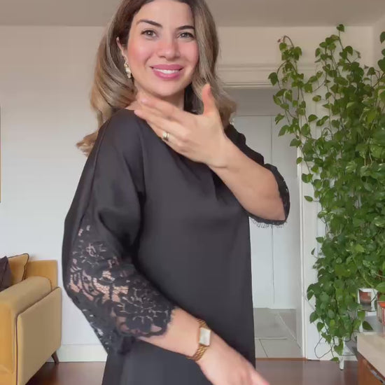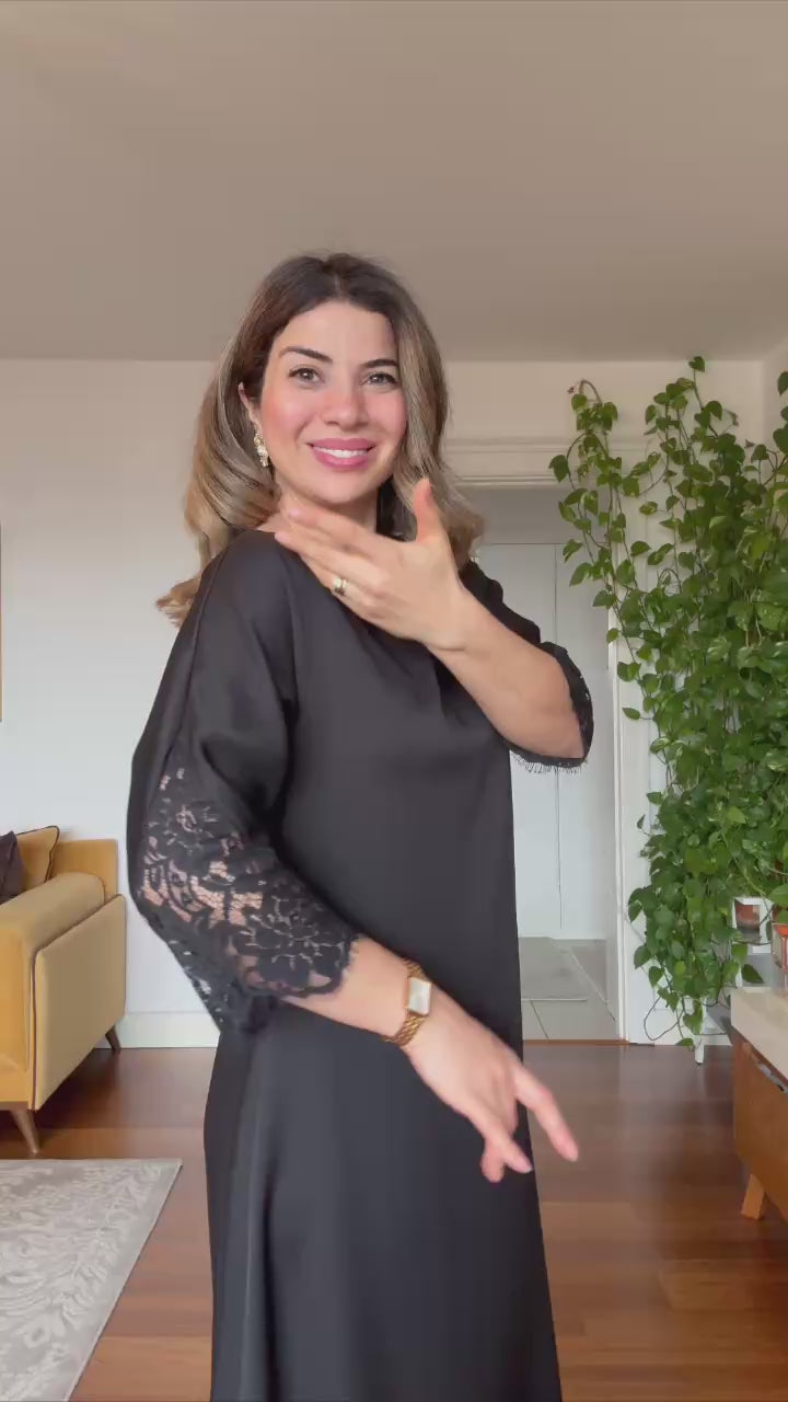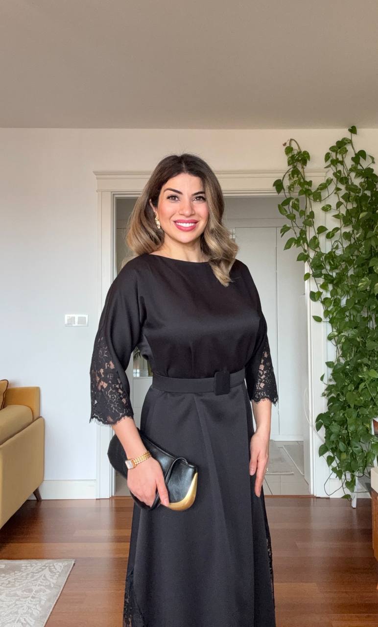 This brown midi dress stands out with its elegant silhouette and feminine details, making it an ideal choice for both everyday wear and special occasions. The lace details on the sleeve cuffs and along the side of the skirt add a romantic and sophisticated touch, while the belted waist design gracefully highlights the figure.