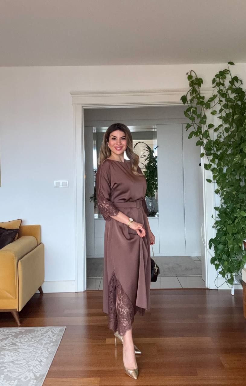 This brown midi dress stands out with its elegant silhouette and feminine details, making it an ideal choice for both everyday wear and special occasions. The lace details on the sleeve cuffs and along the side of the skirt add a romantic and sophisticated touch, while the belted waist design gracefully highlights the figure.