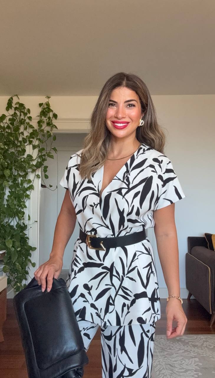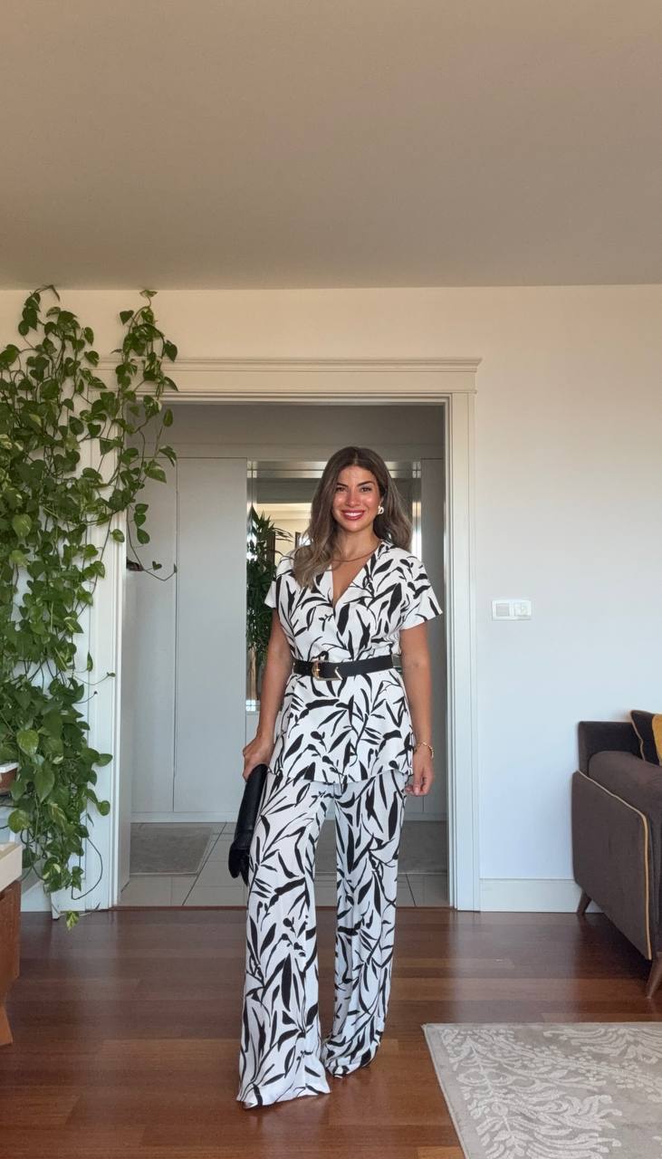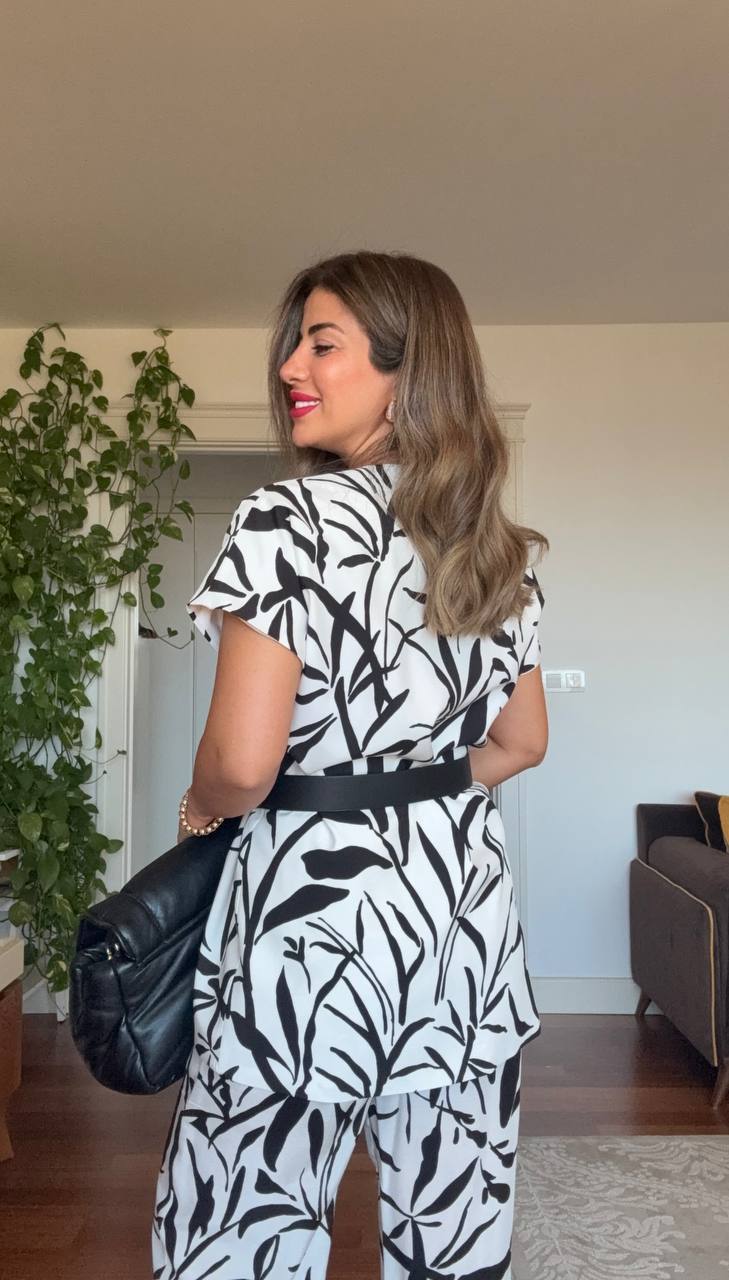 This black and white leaf-printed set brings together modern elegance and everyday comfort. Designed to elevate your style both for casual outings and special occasions, it features a relaxed-fit top with a flattering V-neckline and a flowy silhouette. The wide-leg pants provide both grace and ease of movement, while the adjustable black belt accentuates the waist, creating a balanced and feminine silhouette.