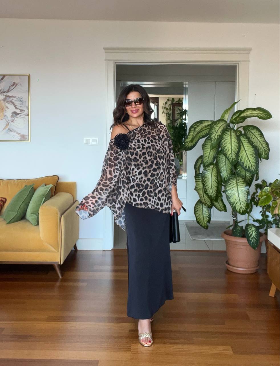 The eye-catching leopard print top, combined with slightly draped and sheer sleeves, adds a feminine touch, while the belted waist and wide-leg bottom gracefully highlight your body shape. Its soft and high-quality fabric ensures comfort throughout the day while complementing your stylish look.