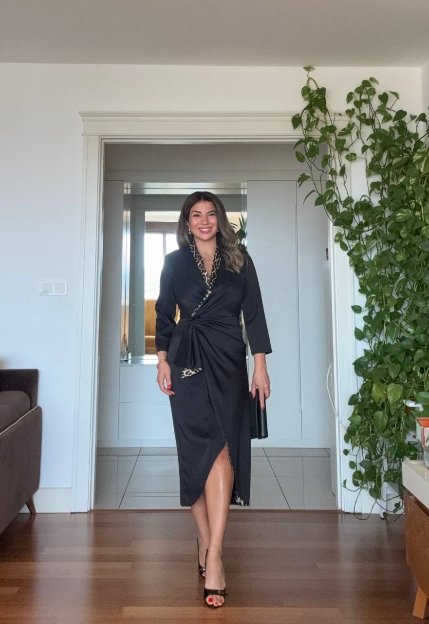 Combining elegance and sophistication, the Leopard Print Wrap Dress – Black reflects the strong style of the modern woman.