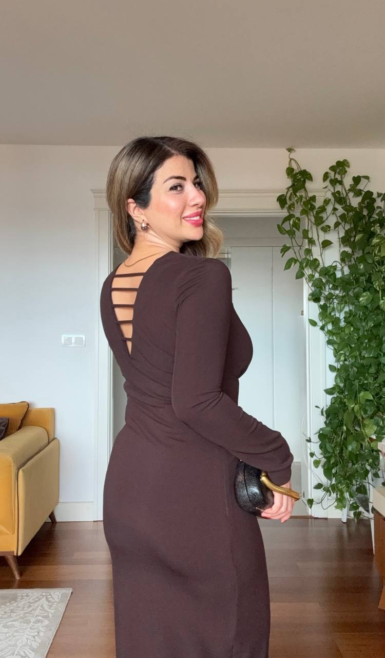 The body-hugging fit, combined with the gathered draped waist and sparkling buckle, creates a flattering silhouette. The open back with strap details adds a modern and chic touch to the overall design.