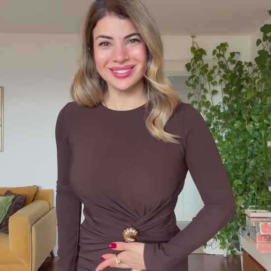 This elegant long dress with side draping and a jeweled buckle detail is designed to highlight your feminine silhouette with refined sophistication. Perfect for special events, dinners, and evening occasions, it offers a timeless and graceful look.
