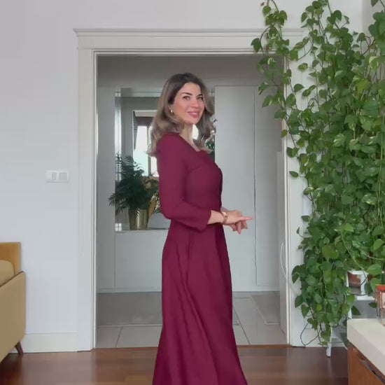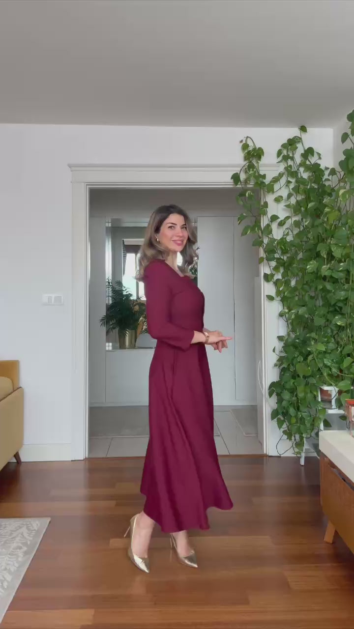 This elegant burgundy midi dress stands out with its feminine silhouette and refined design, making it a perfect choice for both special occasions and stylish gatherings. The modern square neckline adds a sophisticated touch, while the gold front buttons and gold buckle belt bring a luxurious finish to the look.
