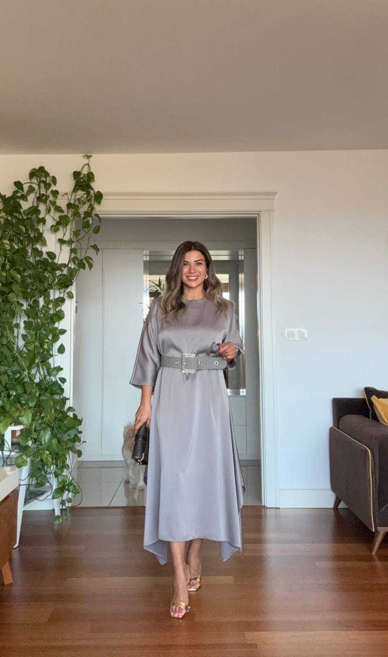 A modern take on elegance: This mink satin-textured midi dress is poised to become a staple in your wardrobe with its simple yet striking style. Its fluid fabric, subtle sheen, and graceful drape bring elegance to every step.