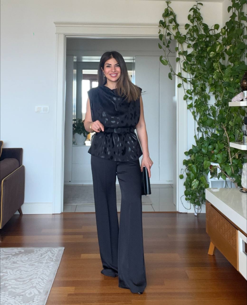 A modern take on timeless elegance! This black set stands out with its shimmering foil details and structured padded shoulders, offering a bold and sophisticated look. The flowing wide-leg pants provide both comfort and grace, making it the perfect blend of ease and elegance.