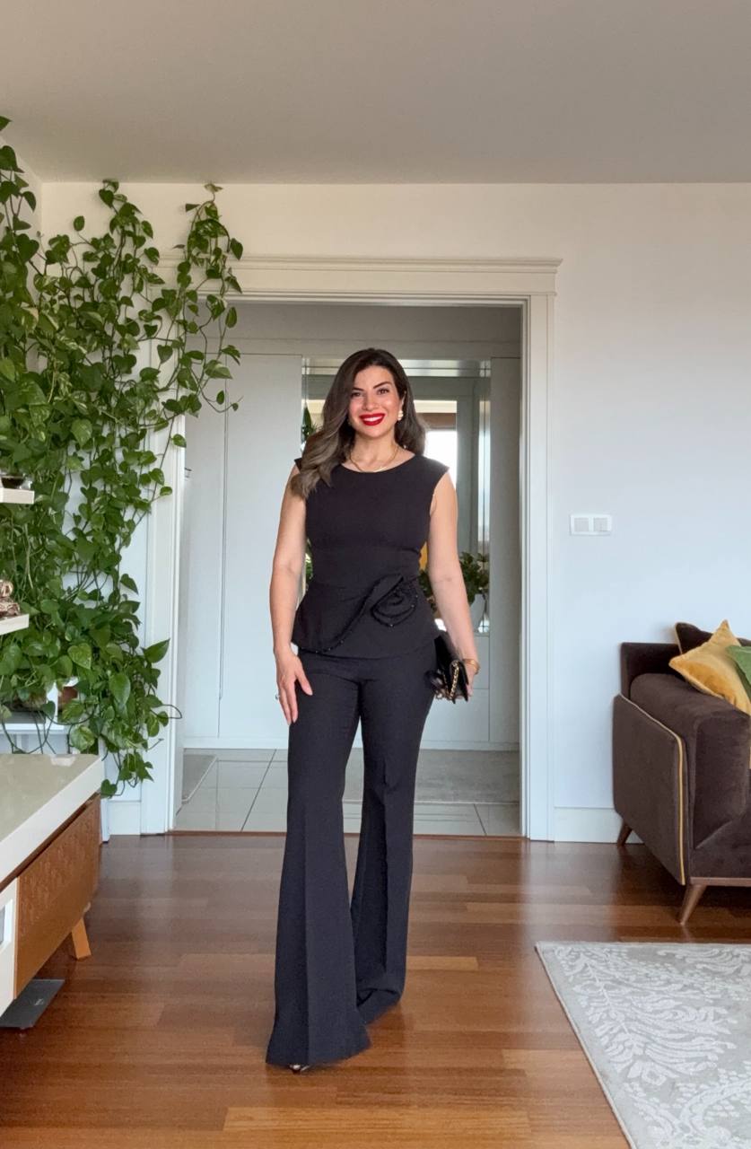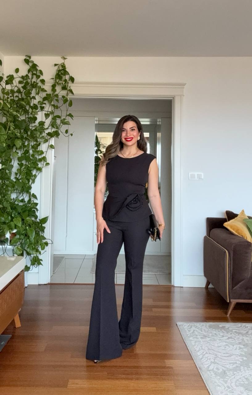 Offering a modern interpretation of flawless elegance, this black suit is designed to reflect your style in every setting—from special events to business meetings. The body-hugging silhouette, elegant peplum cut, and delicate flower-shaped detail make this piece truly stand out. The sleeveless top provides comfort during warmer months and can easily be paired with a blazer. The wide-leg pants visually elongate the legs while adding a sophisticated touch.